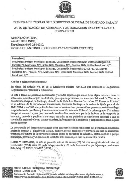 Del Tribunal de Tierra de Jurisdicción Original de María Trinidad Sánchez, expediente 20240134058, A todos quienes pueda interesar, El abogado del Estado VS Asunto: Aviso Requerimiento, Auto de Emplazamiento y Fijación de Audiencia. Por medio de la presente se citan a la siguiente persona, a requerimiento de la señora SANTA CECILIA GRELA MATA DE RONDON, Reclamante de “Una porción de terreno con una extensión superficial de 34,774.19 metros cuadrados dentro del ámbito del D.C 03 en et municipio de Rio San Juan, provincia MARIA TRINIDAD SANCHEZ, Resultante 319619846168. Cuyos trabajos fueron realizados por el Agrimensor MAXIMO ALEXIS VENTURA TAVERAS, CODIA: 40611; Y aprobados mediante el oficio No. 6612023079795 de fecha 6 octubre del 2024, que reposa en el Tribunal de Tierras bajo el número de caso 2024-0134058, a los colindantes, RAMON ISIDRO GIL GUZMAN Y MIGUEL SIMON. Así como también al Agrimensor MAXIMO ALEXIS VENTURA TAVERAS, CODIA: 40611, y a todo el que le pudiera interesar, para que comparezcan a la audiencia que celebrara este Tribunal de Jurisdicción Original de María Trinidad Sánchez, el día 11 de febrero del año 2025, a la 9:00 hora de la mañana localizado en la calle Emilio Conde sin número, esquina calle Club Rotario de esta ciudad de Nagua, Provincia María Trinidad Sánchez, a fin de que den a conocer los derechos que pretenden y las pruebas en que se basan para que al efecto formulen sus reclamaciones de jurisdicción original.