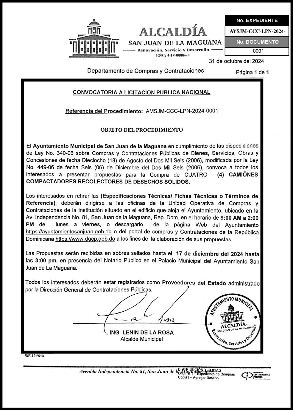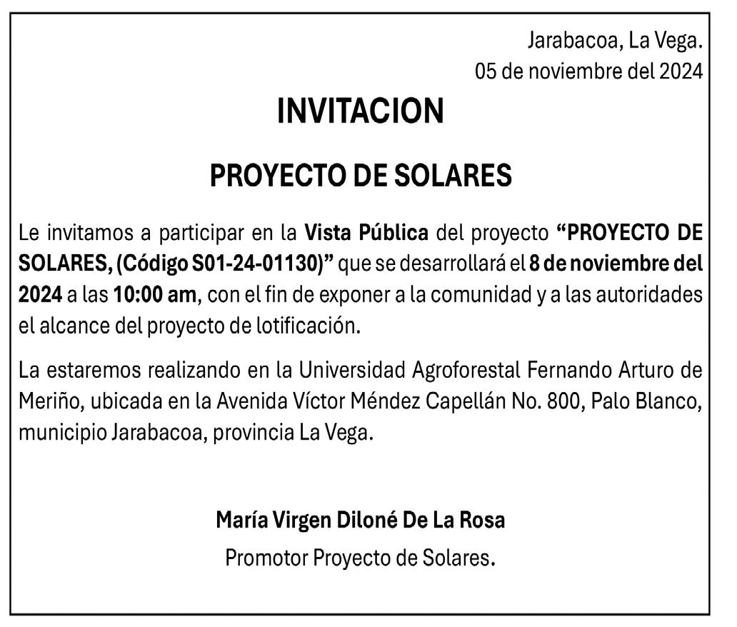 Expediente No.6612024070643 Vista la autorización de la Dirección Regional de Mensuras Catastrales, Departamento Noreste, una vez vista la autorización de fecha 01 de noviembre del año 2024, a petición del señor LUCIANO ULLOA ROSARIO, tengo a bien comunicar que el día 20 del mes de noviembre del año 2024 a las 8:00 A.M. Horas de la mañana, se les dará comienzo a los trabajos de Regularización Parcelaria de una porción de terreno, ubicada en el municipio de Fantino, Provincia Sánchez Ramírez, (Coordenadas de Referencia: 362465.23 E, 2114351.25 N) REFERENCIA: PARCELA No. 17 DC No. 07 MUNICIPIO DE FANTINO, PROVINCIA SÁNCHEZ RAMÍREZ. Este proceso será presentado por el Agrimensor GABINO ANTONIO PADILLA BALBUENA, cédula No. 087-0017610-3, Codia No. 27511, oficina en la calle Duarte, esq. Mella del municipio de Fantino. Quedan citados todos los colindantes y demás personas interesadas. GABINO ANTONIO PADILLA BALBUENA Agrimensor Codia 27511 (AC-36036-WP-U-3/3+)