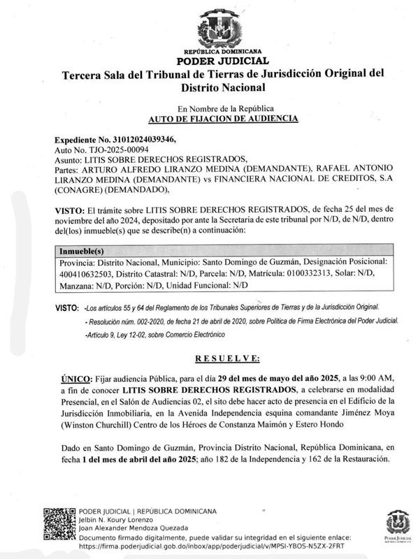 1RA. SALA TRIBUNAL DE TIERRAS DE JURISDICCIÓN ORIGINAL DE LA VEGA R.D. AUTO DE FIJACIÓN AUDIENCIA NO.120-2025 DEL 07/04/2025 Expediente 2025-0068216 Aprobación técnica de la Dirección Reg. de Mensuras Catastrales Depto. Norte No. 6622024030159 DEL 31/01/2025 sobre la mensura para DESLINDE del siguiente Inmueble: PROVINCIA LA VEGA, MUNICIPIO JARABACOA DC/POS 312176083244 superficie 9,705.70m2 parcela 44 del DC 03, Ubicado en zona urbana, Urbanización Rincón, en la Ave. La Confluencia frente al Play de Beisbol. SOLICITANTE: LUIS VIRGILIO RAMIREZ HENRIQUEZ representado por LIC. EDWARD RAFAEL MATIAS REYES. Se citan a todos los colindantes, vendedores, personas que figuren inscritas en el registro complementario de dicho inmueble y demás interesados a la audiencia fijada para el día 30/06/2025 a las 09:00 a.m., a celebrarse en este tribunal sito en Ave. García Godoy #32 esq. calles Duvergé y Mons. Panal, 1er. nivel Palacio de Justicia, Sala 1, de la ciudad de La Vega.