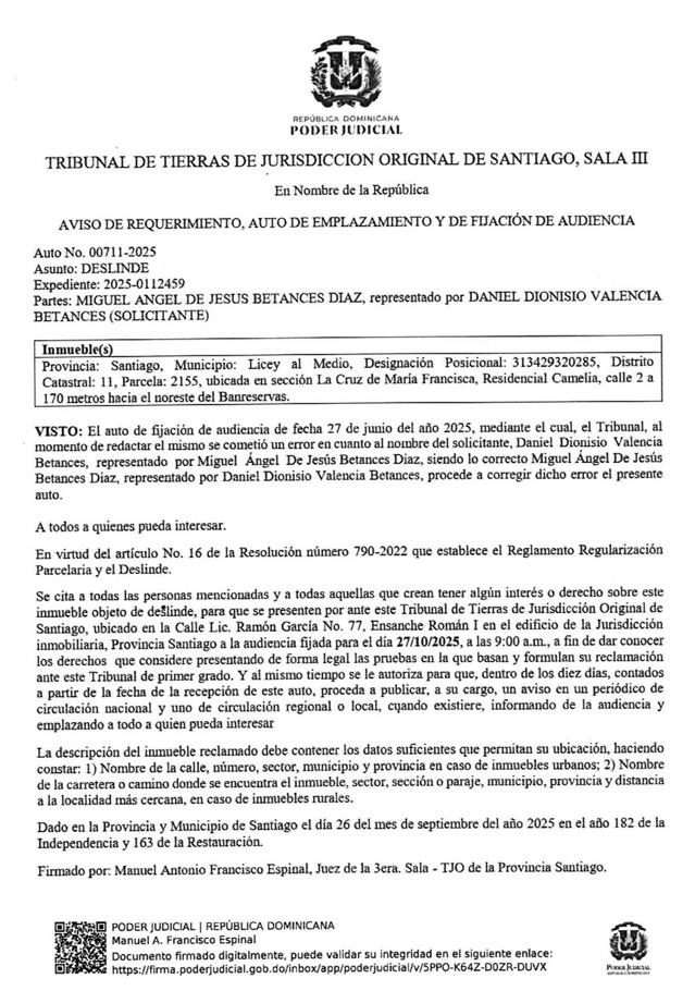 Por medio de la presente hacemos de público conocimiento a Los Colindantes y/o Cualquier interesado/a, que en fecha 10 del mes de noviembre del año 2025 a las 02:00 p. m., El Agrimensor Iván de Jesús Brito Domínguez, CODIA: 29042, Cel: 829-297-8210, Correo Electrónico ivanbrito07@gmail.com, dará inicio a la Mensura para Saneamiento, Dentro del ambito del D. C. No. 7, del Municipio de San Francisco De Macoris, Provincia Duarte. El cual fui autorizado por la Regional de Mensuras Catastrales, Departamento Noreste, en fecha: 23 de septiembre del año 2025, Expediente No. 6612025066038, los reclamante es; Jesus Chenel Hernandez Ortiz, Bettina Baez Gaston Representado/A Por: Juan Pablo Sime Peralta. En cumplimiento del artículo No. 142 de la Resolucion No. 789-2022, que establece el reglamento General de Mensuras Catastrales. En La Carretera Madeja aprox. a 200 mts. al noroeste del Club De Basquebol De Madeja, a 300 mts al noroeste de la Escuela Angel Marte Rosa., coordenadas geográficas: 19.330555, - 70.258856. IVÁN DE JESÚS BRITO DOMÍNGUEZ