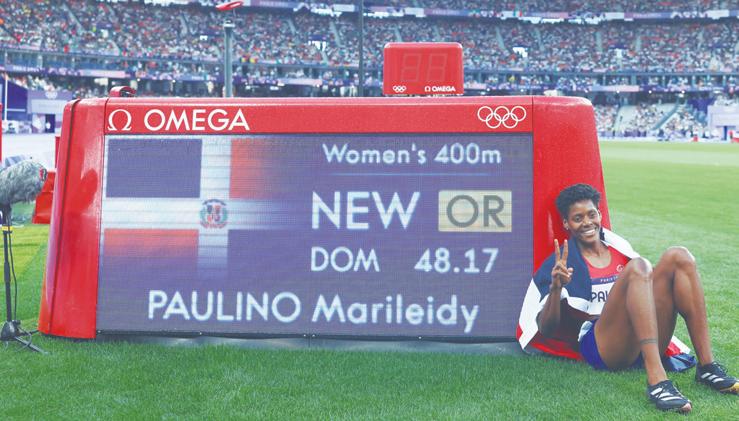 PARÍS.- La dominicana Marileidy Paulino se colgó ayer la medalla de oro de los Juegos de París en los 400 metros, tras ganar la final con mucha autoridad y parar el crono en 48.17, nuevo récord olímpico. Sobre la pista morada y mojada por la lluvia del Estadio de Francia, Paulino se mostró muy superior a sus rivales, ganando con una distancia considerable sobre el resto de finalistas. La velocista dominicana se convirtió en la cuarta mujer más rápida de toda la historia en esta disciplina y batió el récord olímpico, que estaba desde el 29 de julio de 1996, en Atlanta, en posesión de Marie-Jose Perec, encargada de encender el pebetero de estos Juegos el pasado 26 de julio. En la foto, Marileidy exhibe la medalla de oro durante la ceremonia. P.21