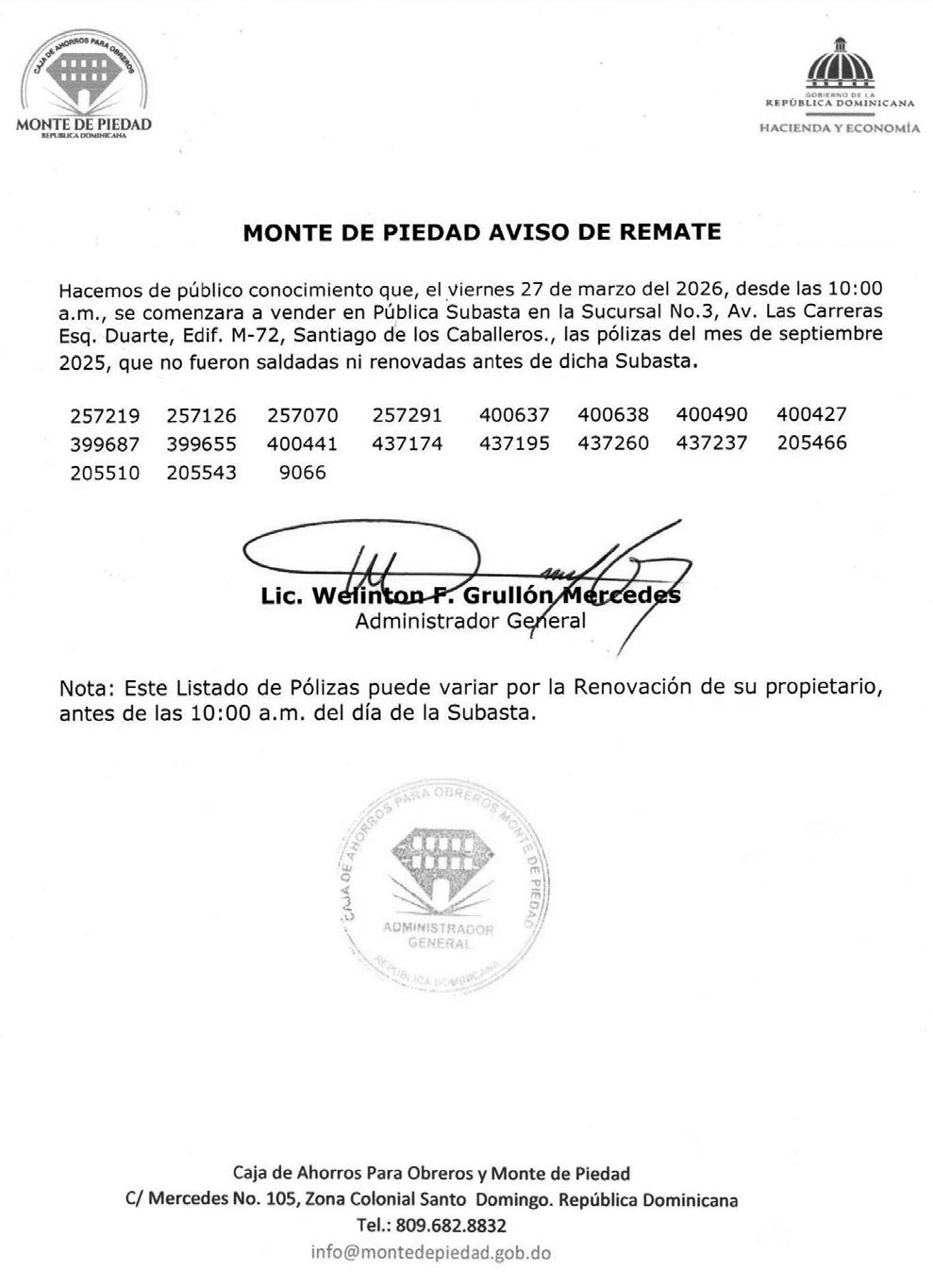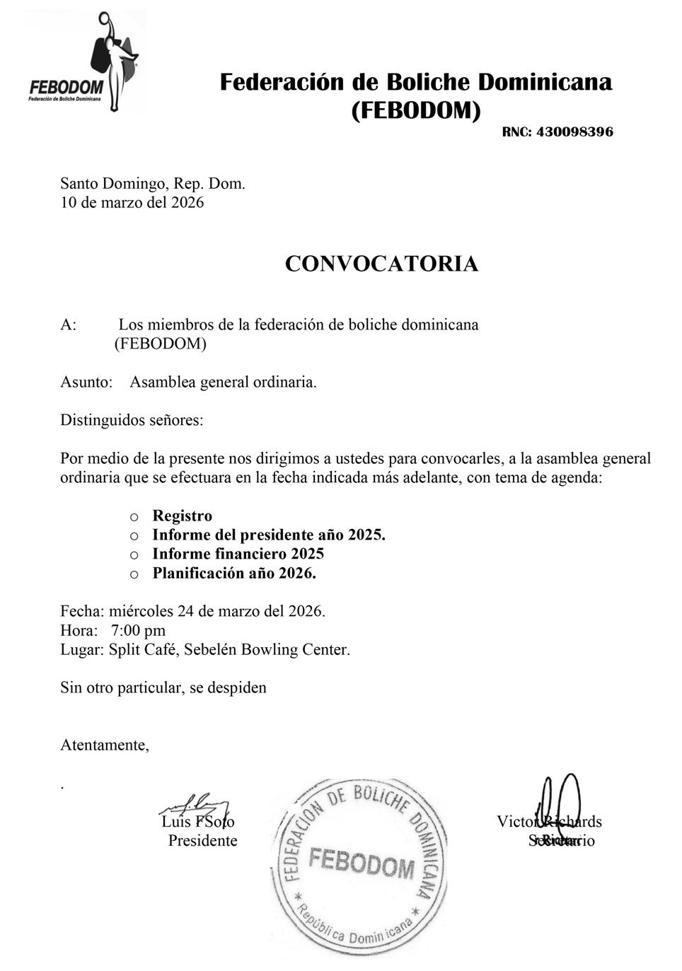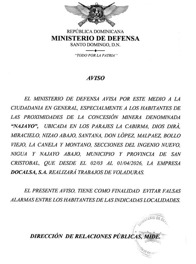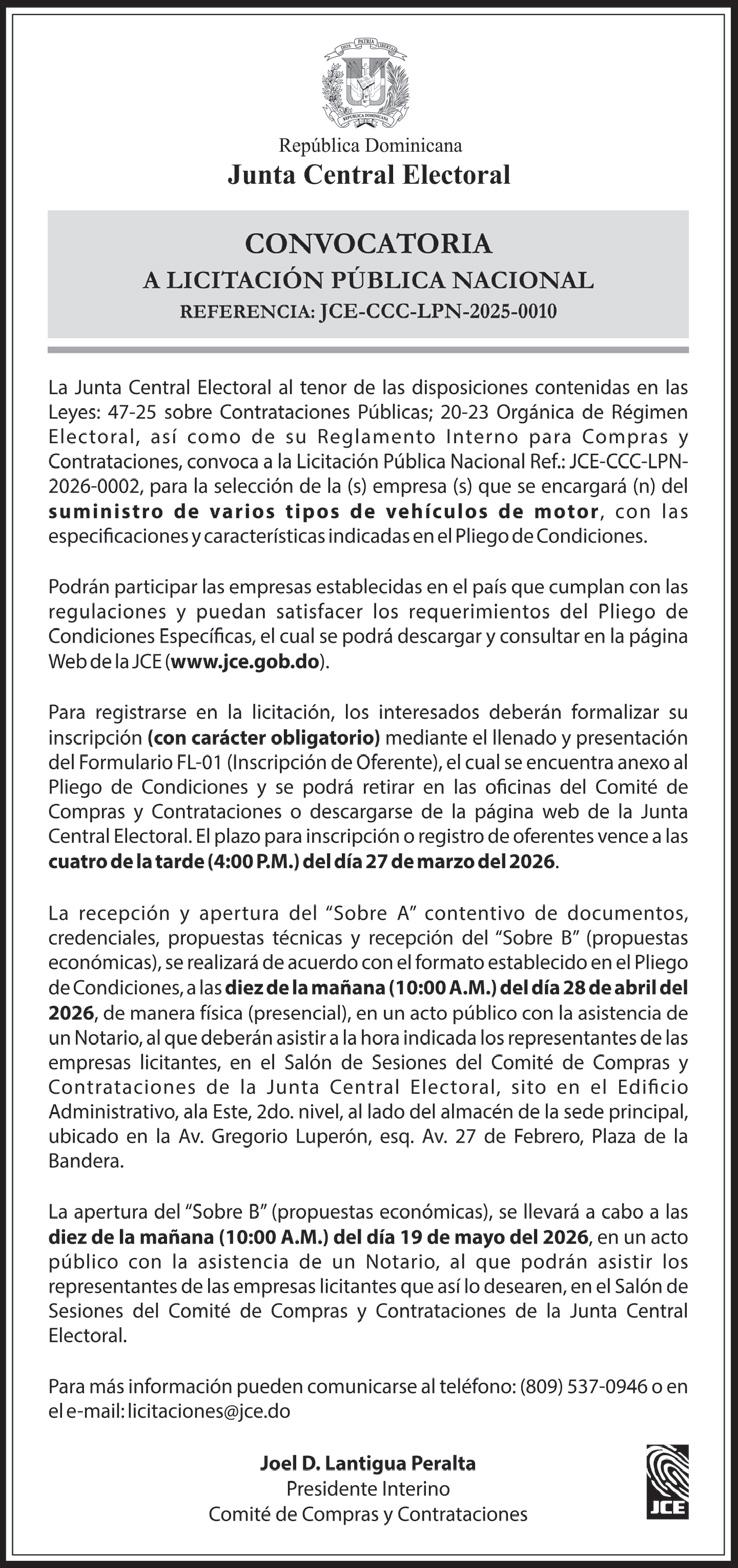 PERDIDA DE MATRICULA: MOTOCICLETA MARCA HONDA MODELO DIO 110 COLOR BLANCO AÑO 1994 PLACA K1673851 CHASIS JF311001005 A NOMBRE DE DAURIN GABRIEL FLORES SOSA – CED. 40223270428 (DJ-AC-43643-WP) AVISO DE INCORPORACION DE ASOCIACIONES SIN FINES DE LUCRO EN CUMPLIMIENTO CON LAS DISPOSICION DEL ARTICULO 5, PARRAFO I, II DE LA LEY 122-05, SE HACE DE PUBLICO CONOCIMIENTO QUE MEDIANTE RESPOLUCION No. 00010, EMITIDA POR LA PROCURADORA GENERAL DE LA REPUBLICA EN FECHA 19 DEL MES DE DICIEMBRE DEL AÑO 2025, FUE ORTOGADO EL BENEFICIO DE INCORPORACION A LA ASOCIACION SIN FINES DE LUCROS; CON SU DOMICILIO EN EL KM. 10, CARRETRA SANCHEZ MARGINAL NORTE, NUM. 24, HONDURAS DEL OESTE, INVI, SANTO DOMINGO, DISTRITO NACIONAL, REPUBLICA DOMINICANA, ESTA ORGANIZACIÓN TIENE POR MISION: LA ENSEÑANZA DE ARTES MARCIALES A NIÑOS, NIÑAS Y ADOLECENTES EL ESTILO DE KARATE WADO RYU; SU OBJETIVO: ES LA REALIZACION DE LAS REFERIDA ACTIVIDAD PARA PRESTAR ASISTENCIA A LA POBLACION DE NIÑOS, NIÑAS Y ADOLECENTES PARA LA RECREACION, TRABAJO DE LA PSICOMOTRICIDA MOTORA Y FINA. TAMBIEN LA ENSEÑANZA DE LA DEFENSA PERSONAL QUE HOY EN DIA ES MUY IMPORTANTE. SUS MIEMBROS FUNDADORES SON: VICTOR SANTIAGO ARACHE MOJICA, JULIO CESAR MARTE MEJIA, JEURY SILVERIO JARDINES CONTRERAS, ANGELO JEREMIAS RIVERA SANCHEZ, IVAN ERNESTO ALTAGRACIA MARTE, JOSE ERNESTO RODRIGUEZ SUSAÑA, YAVE ARACHE DE LA PAZ, JOSE MIGUEL TAVERAS ARACHE Y JUNIOR ALEXIS VILLANUEVA ROSARIO, SU CONSEJO DIRECTIVO TIENE UNA DURACION DE CINCO (5) AÑOS Y ESTA COMPUESTO POR VICTOR SANTIAGO ARACHE MOJICA (PRESIDENTE), JULIO CESAR MARTE MEJIA (VICEPRESIDENTE),
