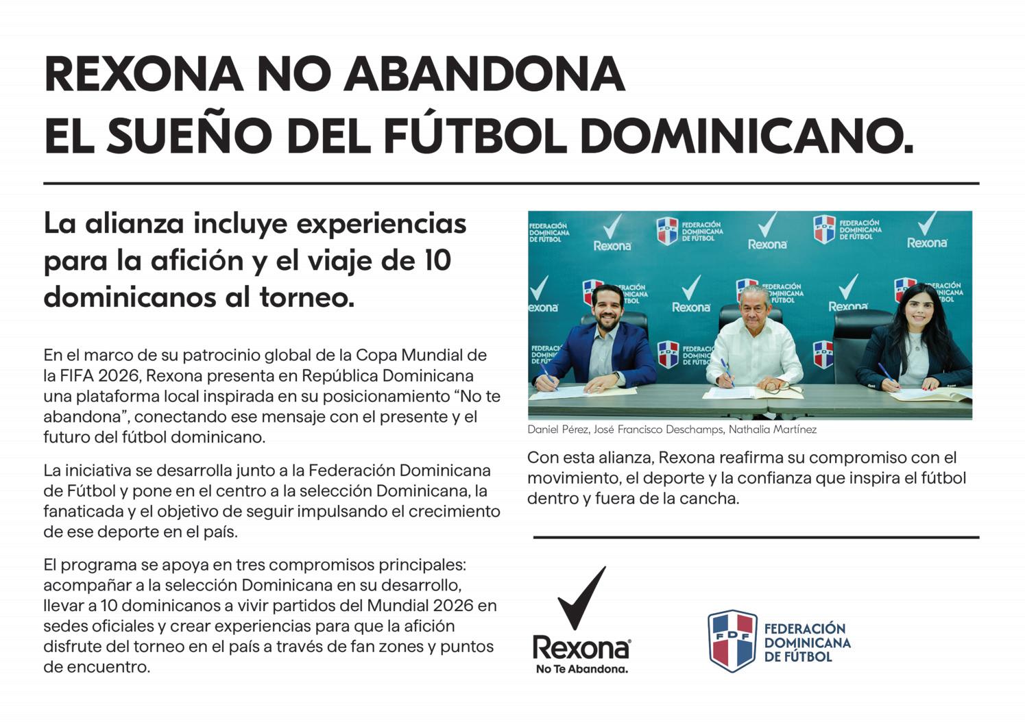 SANTO DOMINGO.– En el marco de su patrocinio global de la Copa Mundial de la FIFA 2026, Rexona presenta en República Dominicana una plataforma local basada en su posicionamiento “No te abandona”, conectando ese mensaje con el presente y el futuro del fútbol dominicano.