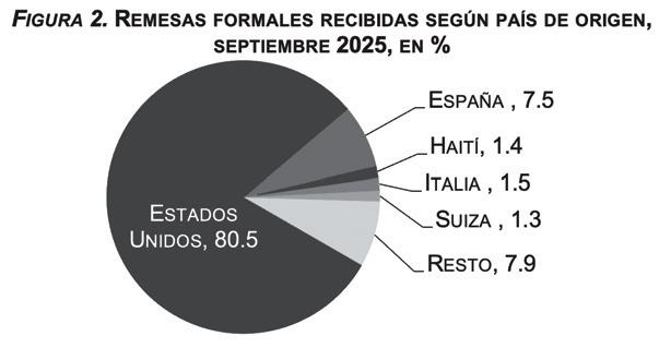 El BCRD destaca también la recepción de remesas por canales formales desde otros países en el mes de septiembre, como España, por un valor de US$68.1 millones, un 7.5 % del total, siendo este el segundo país en cuanto al total de residentes de la diáspora dominicana en el exterior se refiere, así como Italia, Haití y Suiza, con 1.5 %, 1.4 % y 1.3 % de los flujos recibidos, respectivamente. En el resto de la recepción de remesas se distinguen países como Canadá y Francia, entre otros.