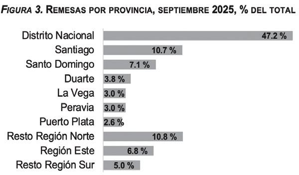 Respecto a la distribución de las remesas recibidas por provincias, el BCRD señala que el Distrito Nacional recibió una proporción del 47.2 % durante septiembre, seguido por las provincias de Santiago y Santo Domingo, con un 10.7 % y 7.1 %, respectivamente. Esto indica que cerca de dos terceras partes de las remesas (65.0 %) se recibe en las zonas metropolitanas del país.