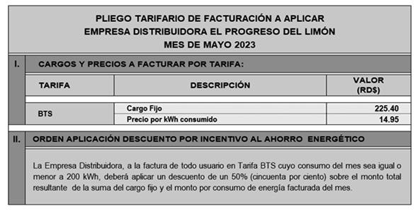 FIJACIÓN TARIFA TRANSITORIA APLICABLE A SUMINISTROS DE USUARIOS REGULADOS SERVIDOS POR LA EMPRESA DISTRIBUIDORA EL PROGRESO DEL LIMÓN, S.R.L., PARA EL MES DE JUNIO DEL AÑO 2023.