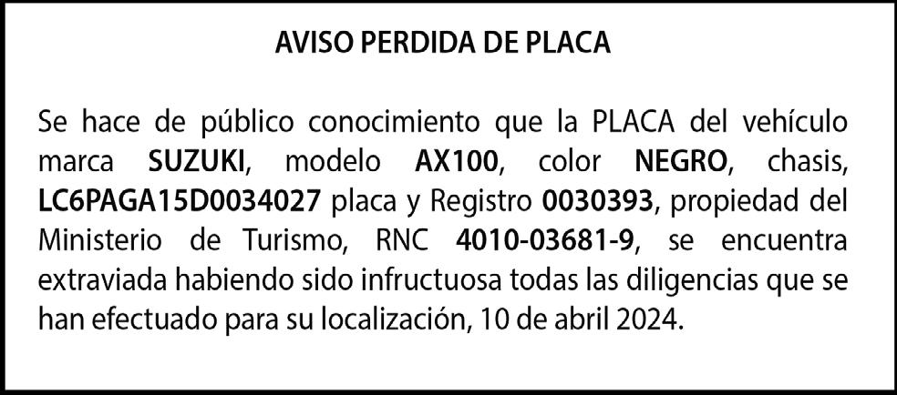 PÉRDIDA DE PLACA: Motocicleta privada marca Suzuki, placa K2436554, color negro, chasis LC6PAGA17N0023273, año 2022, propiedad de INVERSIONES