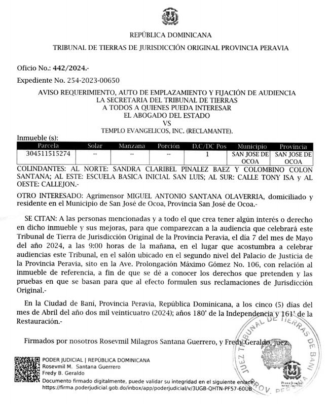 Se Avisa que el Día 02 del mes de mayo del 2024, a las 10:00 am, se dará inicio a los trabajos de Deslinde, de una porción de terreno dentro del ámbito de la parcela No.34, del Distrito Catastral No.06, con una extensión superficial de 222.55m2, ubicada en la calle El Número, No. 19, sector Alpes IV, Autopista de San Isidro, Municipio de Santo Domingo Este, Provincia Santo Domingo, con referencia No. 416273.69; 2046581.23 - Lat.: 18.508064°; Long -69.793178°. Expediente 6632024023778. A petición de: KATY HICHEZ SABINO.