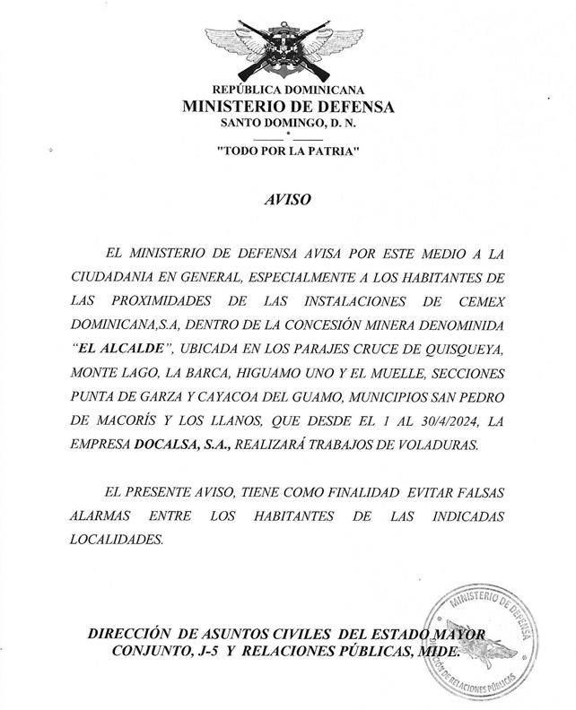 Se Avisa que el Día 04 del mes de mayo del 2024, a las 08:00 am, se dará inicio a los trabajos de Deslinde y subdivisión, de una porción de terreno dentro del ámbito de la parcela No.1-A-51, del Distrito Catastral No.2.2, con una extensión superficial de 1,800.00m2, ubicada en la calle Alfredo Brito Báez, entre la Calle Virginia Elena Ortega y Calle Hilma Contreras, Cucama, Municipio Villa Hermosa, Provincia La Romana con referencia No. 495793.69, 2038588.19 / 18.437480° -69.039833°. Expediente 6642024023102. A petición de: JOSE VENTURA LIZARDO Y JUAN FRANCISCO SEVERINO JIMENEZ.