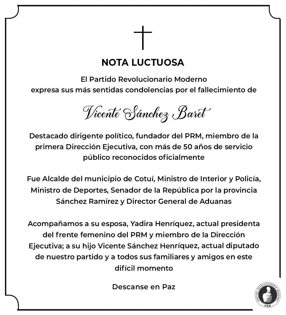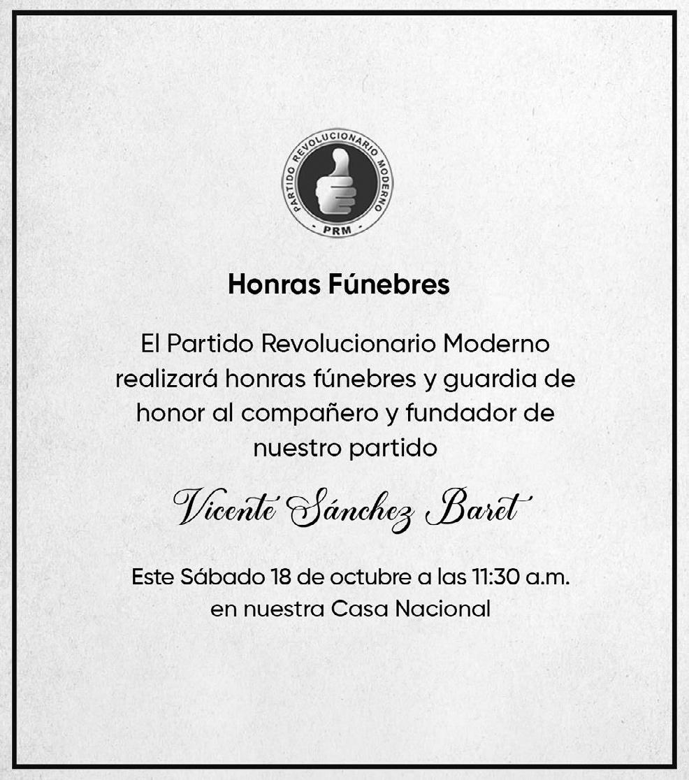 Vicente Sánchez Baret, fundador de los partidos Revolucionario Dominicano y Revolucionario Moderno, una figura de amplia trayectoria y ejemplo de compromiso con el país, falleció el pasado jueves 16 de octubre.