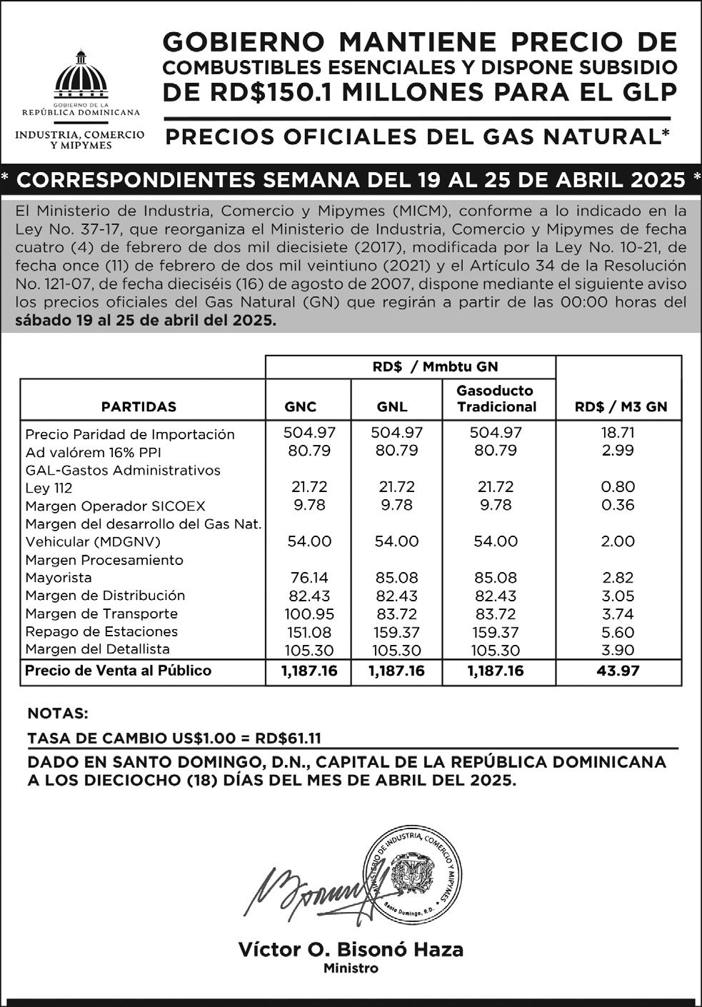 Gas Natural RD$43.97 por m3 mantiene su precio. La tasa de cambio promedio semanal es de RD$61.11 de las publicaciones diarias del Banco Central.