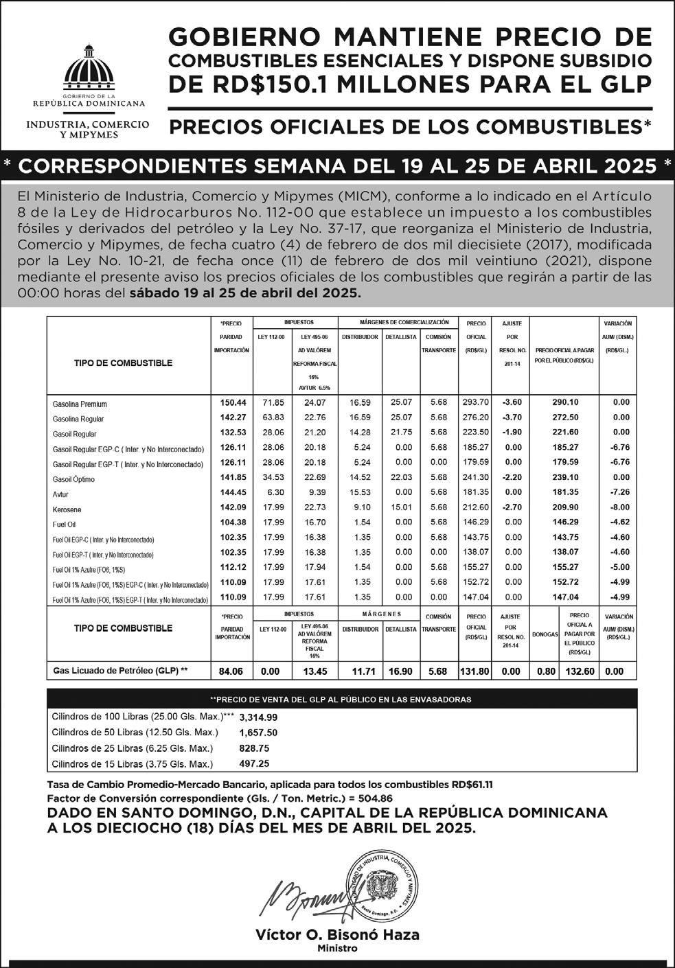 SANTO DOMINGO. - El viceministro de Comercio Interno del Ministerio de Industria, Comercio y Mipymes (MICM), Ramón Pérez Fermín, informó este viernes que el Gobierno del presidente Luis Abinader dispuso un subsidio de RD$150.1 millones para mantener sin variación el precio del GLP para esta semana. Para el período del 19 al 25 de abril del 2025 será subsidiado el Gas Licuado de Petróleo (GLP) en RD$18.14 por galón.