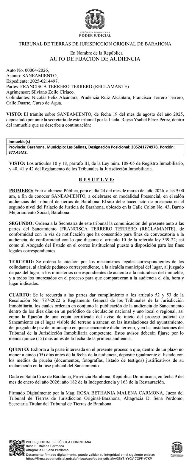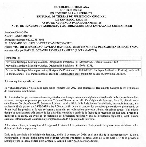 En cumplimiento con lo establecido en la Ley de Registro Inmobiliario número 108-05 y el Reglamento de los Tribunales Superiores de Tierras y de Jurisdicción Original de la Jurisdicción Inmobiliaria, se hace de conocimiento público que, mediante Auto de Fijación de Audiencia, el Tribunal de Tierras de Jurisdicción Original de María Trinidad Sánchez, fija audiencia del expediente número 2025-0208427, para conocer del Saneamiento cuya Designación Catastral Posicional Número 411353581536, se encuentra ubicada en La Ceja, distrito municipal San José de Matanzas, de esta ciudad y municipio de Nagua, provincia María Trinidad Sánchez, reclamado por los señores WENDY YCENIA HILARIO GRULLÓN RAMÓN EMILIO HILARIO. Colindantes: ZOILO ANTONIO ESPINAL MEDINA, LUCIO HERNÁNDEZ DE LA CRUZ, JACINTO SANTOS, CHUCHO LAVANDIER. Otros interesados. AGRIM. DIEGO ANTONIO PÉREZ GONZÁLEZ, CODIA: 43127; La secretaria del Ayuntamiento de Nagua, Alcalde Pedáneo de La Cejas, distrito municipal San José de Matan, secretaria del Juzgado de Paz del municipio de Nagua. Dicha audiencia está fijada para el día Martes Tres (3) del mes de Febrero del año 2026, a las 9:00 A.M., a celebrarse en el salón de Audiencias del Tribunal de Tierras de Jurisdicción Original de la Provincia María Trinidad Sánchez, ubicado en el segundo nivel del Palacio de Justicia de Nagua, en la calle General Emilio Conde, esquina Club Rotario de la Ciudad de Nagua, Provincia María Trinidad Sánchez. DIEGO ANTONIO PÉREZ GONZÁLEZ