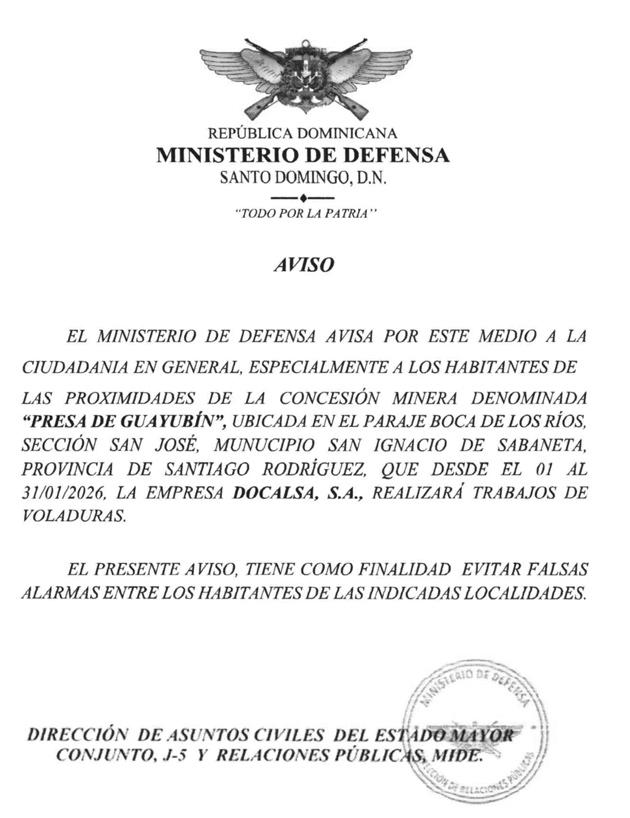 Se hace de conocimiento público, que el día 4 DE FEBRERO DE 2026, a las 10:00 A. M., se realizarán los trabajos de MENSURA PARA SANEAMIENTO, del D. C. No. 02, del Municipio Cabrera, Provincia María Trinidad Sánchez, con una superficie en derechos de 79,556.52 m2, amparados en la ocupación pacífica inequívoca e interrumpida por más de 20 años de los reclamantes, quienes poseen dicha propiedad, reclamada por los señores Ana Ramona García De Taveras, Mario Garcia Hilario, Yegeni García Martínez, Francisco Antonio García Hilario, José Alberto Tavares García, Martin García Hilario, Jhonny García Hilario, Merenciana García Hilario, Rolando Antonio García Hilario, Yisaura García De Torres, Luis García Hilario Y Mariana Karla Picazo Rojas, debidamente representados por la LICDA. ALICIA ARGENTINA JULIÁN GONZÁLEZ, Expediente Núm. 6612025093851. El inmueble se encuentra ubicado en el Camino a Caño Azul, en la Sección La Entrada, Lugar el Brocal, del Municipio de Cabrera, República Dominicana. Coordenadas 18.4516608,-69.943296.