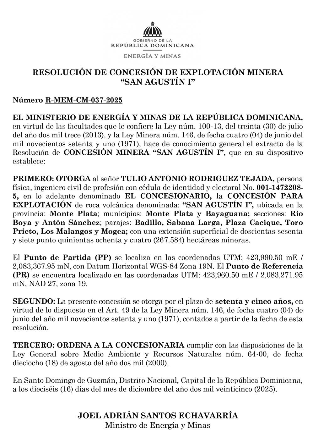 Se hace de conocimiento público, que el día 3 DE FEBRERO DE 2026, a las 4:00 P. M., se realizarán los trabajos de MENSURA PARA SANEAMIENTO, del D. C. No. 05, del Municipio Piedra Blanca, Provincia Monseñor Nouel, con una superficie en derechos de 39,216.90 m2, amparados en la ocupación pacífica inequívoca e interrumpida por más de 20 años de los reclamantes, quienes poseen dicha propiedad, reclamada por el señor RAFAEL MARTIN ROMERO LOPEZ, Expediente Núm. 6622025198096. El inmueble se encuentra ubicado en la Carretera Principal a unos 80 metros de la Carretera Juan Adrian – Zumbador, en el Zumbador, del Municipio Piedra Blanca, Republica Dominicana. Coordenadas 18.7582293195, -70.326534557.