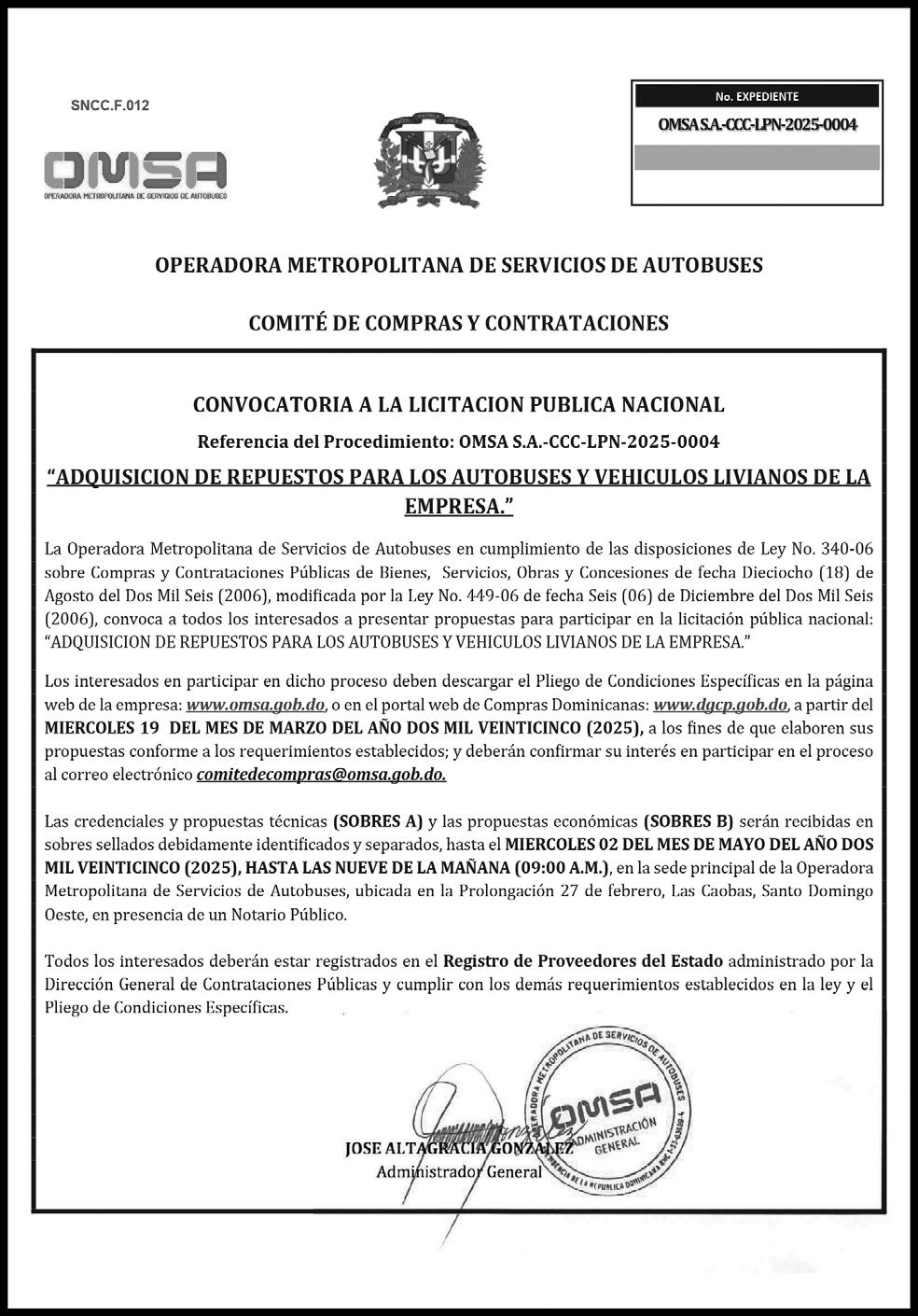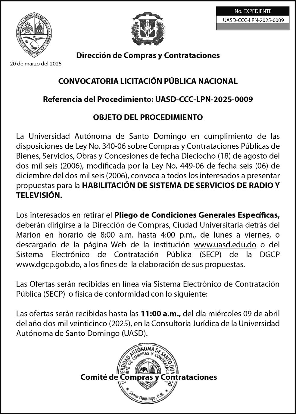 AVISO DE VENTA EN PÚBLICA SUBASTA POR CAUSA DE EMBARGO DE NAVE MARITIMA De conformidad con el artículo 179 de la Ley 5-23 675 y 183, y conforme a los Avisos publicados en fecha 21 de noviembre del año 2024 y en fecha 7 de febrero del año 2025 en este mismo periódico o se hace la presente publicación: FECHA DE LA ADJUDICACION: el día miércoles que contaremos nueve (9) del mes de abril del año Dos Mil Veinticinco (2025), a las nueve (9:00 a.m.) horas de la mañana. TRIBUNAL ANTE EL CUAL SE EFECTUARÁ: Cámara Civil, Comercial y de Trabajo del Juzgado de Primera Instancia del Distrito Judicial de Peravia. En la audiencia de pregones que al efecto celebrará en sus salones de audiencias públicas, Sito en uno de los departamentos de la Segunda Planta. Del Palacio de Justicia de la ciudad de Bani, ubicado en la avenida Máximo Gómez No. 106 DESCRIPCION Del MUEBLE: ´´ «Embarcación marítima «CETUS I» (ANTERIORMENTE DENOMINADA NISSI COMMANDER I, IMO:8705333)», matricula número 54103-PEXT y IMO número 8705333 (tipo tanquero), año de fabricación 1988, 143.00 metros de eslora y 18.0 metros de manga, propiedad de la sociedad GASTON CAPITAL LTD, Registro No. 105424, con sus equipos, la cual se encuentra atracada y surta en uno de los muelles del Astillero Cirramar Las Calderas, sito en la Carretera Máximo Gómez, Las Calderas, Municipio Baní, Provincia Peravia, República Dominicana, la cual esta provista de capitán y tripulación». .PERSÍGUIENTE: señor ROSENDO BIENVENIDO ARIEL DECAMPS RAMOS, dominicano, mayor de edad, miembro de la A.R.D. soltero, portadora de la cédula de identidad y electoral No. 001-1289836-6, domiciliado y residente en Santo Domingo, con elección de domicilio, en la calle Principal No. 125, del sector Fundación de Peravia, del Municipio de Bani, provincia Peravia; quien tiene como abogado constituido y apoderado especial al Lic. WILFREDO ANTONIO ALMONTE, dominicano, mayor de edad, soltero, portador de la cedulas de identidad y electoral número 037-0019271-3, Abogado de los tribunales de la República, matriculado en el CARD, con el número 36571-97-08, celular 809-861-0808, correo electrotécnico: wilfredoantonioalmonte@gmail.com, con estudio profesional abierto en segundo nivel, cubículo No.2, del edificio ubicado en la avenida Imbert Barreras No. 50, de esta ciudad de Puerto Plata y ad-hoc en la calle Principal No. 125, del sector Fundación de Peravia, del Municipio de Bani, provincia Peravia; EMBARGADAS: «CETUS I» (ANTERIORMENTE DENOMINADA NISSI COMMANDER I, IMO:8705333)» y la sociedad GASTON CAPITAL LTD, Registro No. 105424. ENUNCIACIONES PRELIMINARES: El Pliego de Condiciones, el cual regirá la venta del bien embargado, fue depositado en la Secretaría del de la Cámara Civil, Comercial y de Trabajo del Juzgado de Primera Instancia del Distrito Judicial de Peravia, en fecha 8 de noviembre del año dos mil veinticuatro (2024). PRECIO: El precio de la primera puja fijado por el Persiguiente, es por la suma de SIETE MILLONES QUINIENTOS MIL DÓLARES DE LOS ESTADOS UNIDOS DE AMÉRICA CON 00/100 (US$7,500,000.00). Garantía estipulada: para ser Licitador es necesario depositar el tres por ciento (3%) del precio de la primera puja en dinero efectivo o en cheque bancario certificado, pudiéndose licitar pagando en dinero en efectivo el día de la venta o en cheque no certificado girado a favor del persiguiente, pudiendo ser depositado en la Secretaria de la Cámara Civil, Comercial y de Trabajo del Juzgado de Primera instancia del Distrito Judicial de Peravia, y dar cumplimiento al pliego de condiciones depositado en la de dicho tribunal. En la Ciudad de Bani, provincia Peravia República Dominicana, a los diecinueve (19) días del de mes de marzo del año Dos Mil Veinticinco (2025). Lic. WILFREDO ANTONIO ALMONTE SANTOS Abogado del persiguiente