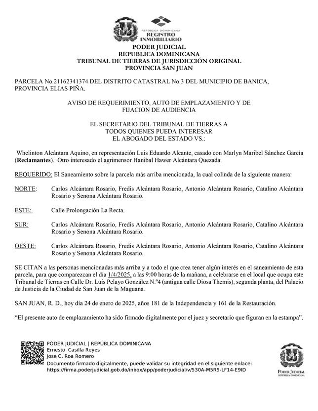 2da. Sala Tribunal De Tierras Jurisdicción Original La Vega, R.D. Auto de Fijacion de Audiencia del 13/01/2025 Expediente 2024-0159086 Aprobación técnica de la Dirección Reg. de Mensuras Catastrales Depto. Norte No. 6622024013440 del 24/10/2024 de mensura para DESLINDE del siguiente Inmueble: municipio y provincia LA VEGA DC/POS 313126029200 area 255.53m2 Parcela 1636, DC 03, ubicado en Piedra Blanca del Salto, calle Piedra Blanca Abajo a 1.2km de la calle principal lado derecho está el inmueble DM Buena Vista. SOLICITANTES: RENNY SANTIAGO ROMAN DURAN Y FRANCELLY SORIBEL ROSARIO DE ROMAN representado por LIC. LEURYS AQUILINO PEREZ BONIFACIO. Se citan a todos los colindantes, vendedores, personas que figuren inscritas en el registro complementario de dicho inmueble y demás interesados a la audiencia fijada para el día 12/06/2025 a las 09:00 a.m., a celebrarse en este tribunal sito en Ave. García Godoy #32 esq. calles Duvergé y Mons. Panal, 1er. nivel Palacio de Justicia, Sala 2, de la ciudad de La Vega. ANIBELKA MERCEDES RODRIGUEZ DELGADO JUEZA (LAPB-AC-38068-WP-PEND)