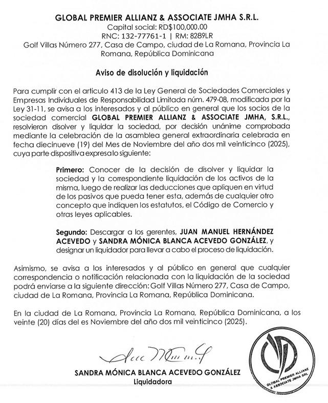 POR MEDIO DEL PRESENTE AVISO SE COMUNICA Y SE DECLARA LA PÉRDIDA DEL CERTIFICADO FINANCIERO NÚMERO: 80-000819959, EMITIDO POR LA COOPERATIVA VEGA REAL, INC., A NOMBRE DEL SEÑOR ANTONIO DÍAZ COSME, PROVISTO DE LA CÉDULA DE IDENTIDAD Y ELECTORAL NÚMERO: 047-0176198-5. DICHO CERTIFICADO ESTÁ CONSIGNADO POR UN MONTO ASCENDENTE A DOS MILLONES CINCUENTA MIL PESOS CON 00/100, (RD$2,050,000.00) CON FECHA DE EMISIÓN DEL OCHO (8) DE ENERO DEL AÑO DOS MIL VEINTICINCO (2025). LA PRESENTE PUBLICACIÓN SE REALIZA EN CUMPLIMIENTO DE LA LEY Y LOS PROCEDIMIENTOS ESTABLECIDOS AL RESPECTO.