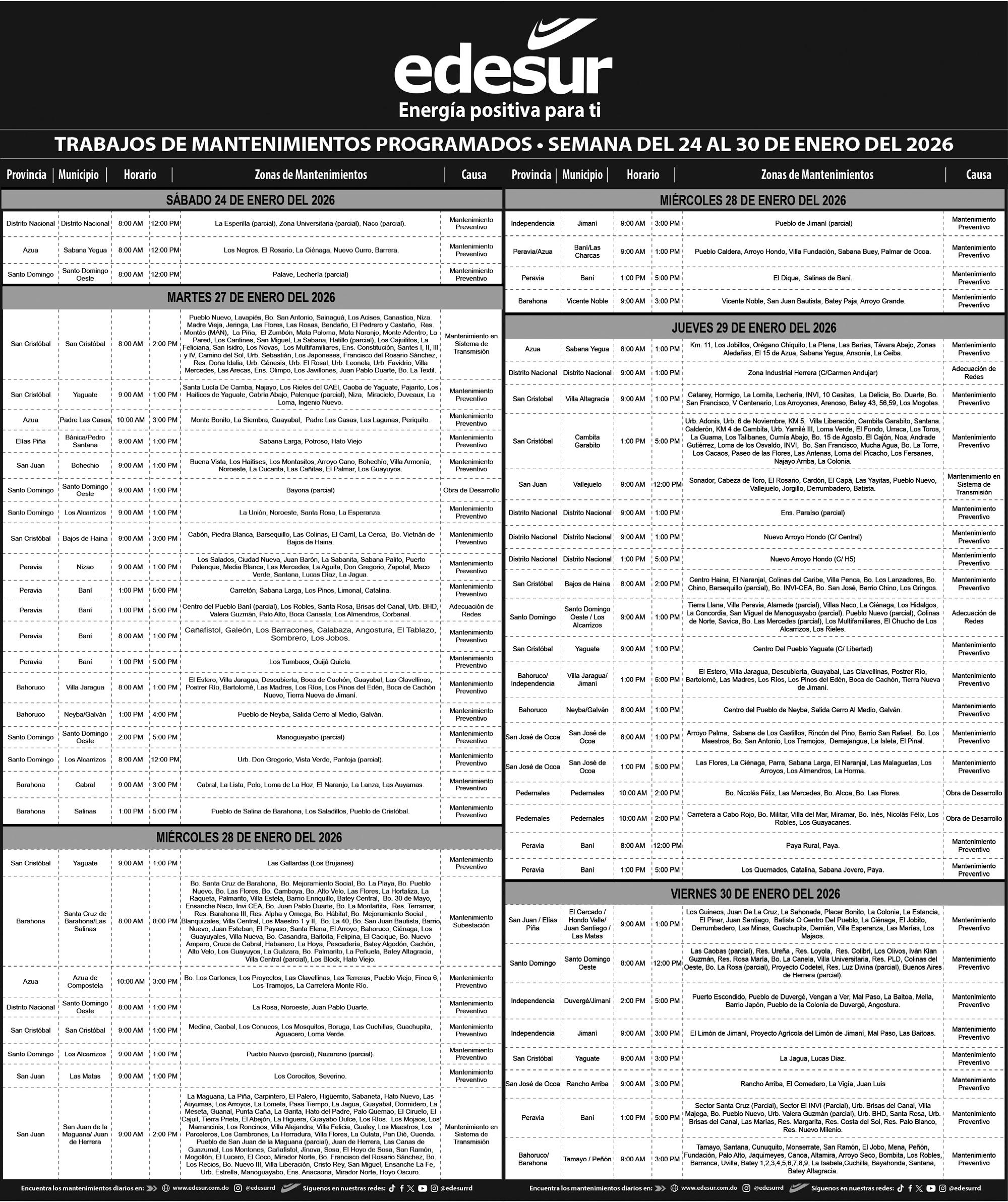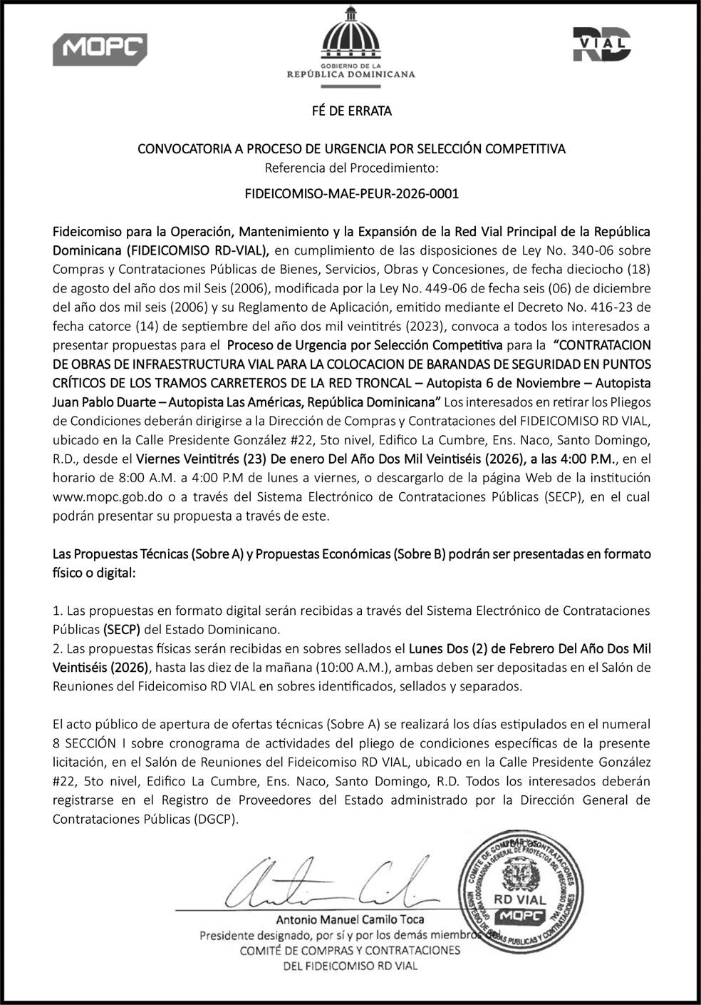 Se avisa que en fecha 17/01/2026 salió publicado el siguiente Aviso Mensura Catastral Expediente No. 6622025178982 Se avisa que el día 30 del mes de diciembre SIENDO LO CORRECTO: 30 del mes de ENERO del año 2026 a las 8:00 a.m. el Agrimensor Nelson Cesar Milian Capellan, Codia 5838, con domicilio en la calle Núñez de Caceres 62, La Vega, R.D., correo ing.nelson.milian@gmail.com iniciará los trabajos de mensura catastral para saneamiento de una porción de terreno ubicada desde la carretera La Torre Los Peladeros hacia el sur avanzamos aproximadamente 1.1kms hasta el inmueble en el ámbito del Distrito Catastral no. 26 municipio Concepción de La Vega Provincia La Vega. COORDENADAS GEOGRAFICAS: 19.3249072°, -70.656452° Estos trabajos fueron autorizados por la Dirección Regional de Mensuras Catastrales Departamento Norte en fecha 04 del mes de noviembre del año 2025. Propiedad de ALONZO RODRIGUEZ PEÑA. Quedan citados todos los colindantes y demás personas interesadas.