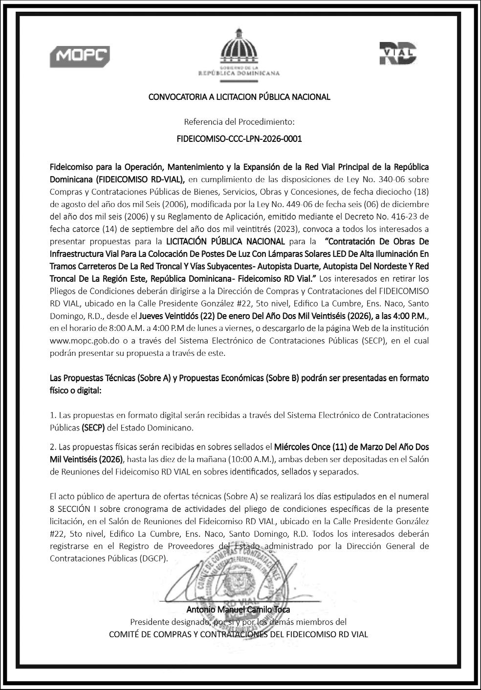 4.- Publicación: Este aviso se publica en cumplimiento del Artículo 413 de la Ley No. 479-08. En Santo Domingo, Distrito Nacional, República Dominicana, a los 23 días del mes de enero del año 2026. Atentamente,