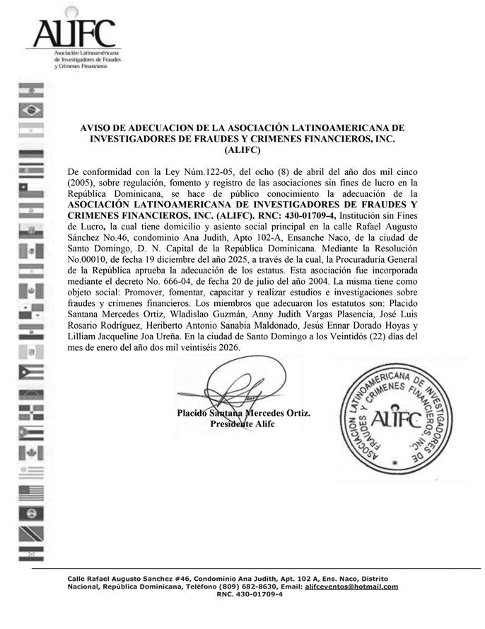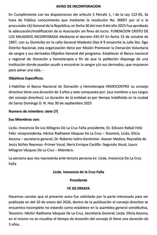 AVISO DE INCORPORACIÓN DE ASOCIACIONES SIN FINES DE LUCRO EN CUMPLIMIENTO CON LAS DISPOSICIONES DEL ARTÍCULO 5, PÁRRAFO I, II, DE LA LEY 122-05, SE HACE DE PÚBLICO CONOCIMIENTO QUE MEDIANTE RESOLUCIÓN NO. 0019-2025 EMITIDA POR LA PROCURADURIA REGIONAL DE SAN CRISTOBAL, EN FECHA 29 DE DICIEMBRE DEL AÑO 2025, FUE OTORGADO EL BENEFICIO DE INCORPORACIÓN A LA ASOCIACIÓN SIN FINES DE LUCRO: ASOCIACIÓN DE TENIS DE CAMPO DE AZUA, ASTECA, INC, CON SU DOMICILIO EN C/ BARTOLOME OLEGARIO PEREZ, NO. 10, SAVICA, AZUA. ESTA ORGANIZACIÓN TIENE POR MISIÓN PROMOVER EL DEPORTE DEL TENIS DE CAMPO, EN TODA LA PROVINCIA DE AZUA, INCENTIVANDO LO MAS FINOS VALORES DE VIDA EN LA JUVENTUD Y EN TODOS LOS AZUANOS, QUE TIENE POR OBJETIVOS INCENTIVAR LA PRACTICA DEL TENIS EN TODA LA JUVENTUD, MOTIVAR LA SALUD A TRAVES DE LA PRACTICA DEL DEPORTE DE TENIS, REPRESENTADA POR SU PRESIDENTE SAMUEL DE LA CRUZ, LA DURACIÓN DE LA ENTIDAD ES POR TIEMPO INDEFINIDO. EN LA CIUDAD DE CIUDAD DE AZUA, REPUBLICA DOMINICANA, HOY DÍA [20] DEL MES DE [ENERO] DEL AÑO 2026.