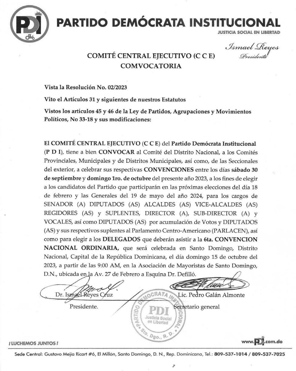 El COMITÉ CENTRAL EJECUTIVO (C C E) del Partido Demócrata Institucional (PDI), tiene a bien CONVOCAR al Comité del Distrito Nacional, a los Comités Provinciales, Municipales y de Distritos Municipales, así como, de las seccionales del exterior, a celebrar sus respectivas CONVENCIONES entre los días sábado 30 de septiembre y domingo 1ro. de octubre del presente año 2023, a los fines de elegir a los candidatos del Partido que participarán en las próximas elecciones del día 18 de febrero y las Generales del 19 de mayo del año 2024, para los cargos de SENADOR (A), DIPUTADOS (AS), ALCALDES (AS), VICEALCALDES (AS), REGIDORES (AS) y SUPLENTES, DIRECTOR (A), SUB-DIRECTOR (A) y VOCALES, así como DIPUTADOS (AS) por acumulación de votos y DIPUTADOS (AS) y sus respectivos suplentes al Parlamento Centro-Americano (PARLACEN), así como para elegir a los DELEGADOS que deberán asistir a la 6ta. CONVENCION NACIONAL ORDINARIA, que será celebrada en Santo Domingo, Distrito Nacional, Capital de la República Dominicana, el día domingo 15 de octubre del 2023, a partir de las 9:00 AM, en la Asociación de Mayoristas de Santo Domingo, D.N., ubicada en la Av. 27 de Febrero esquina Dr. Defilló.