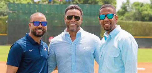 Miguel Matos y Henry González, de la Oficina de MLB en el país, junto al gerente Nelson Cruz.