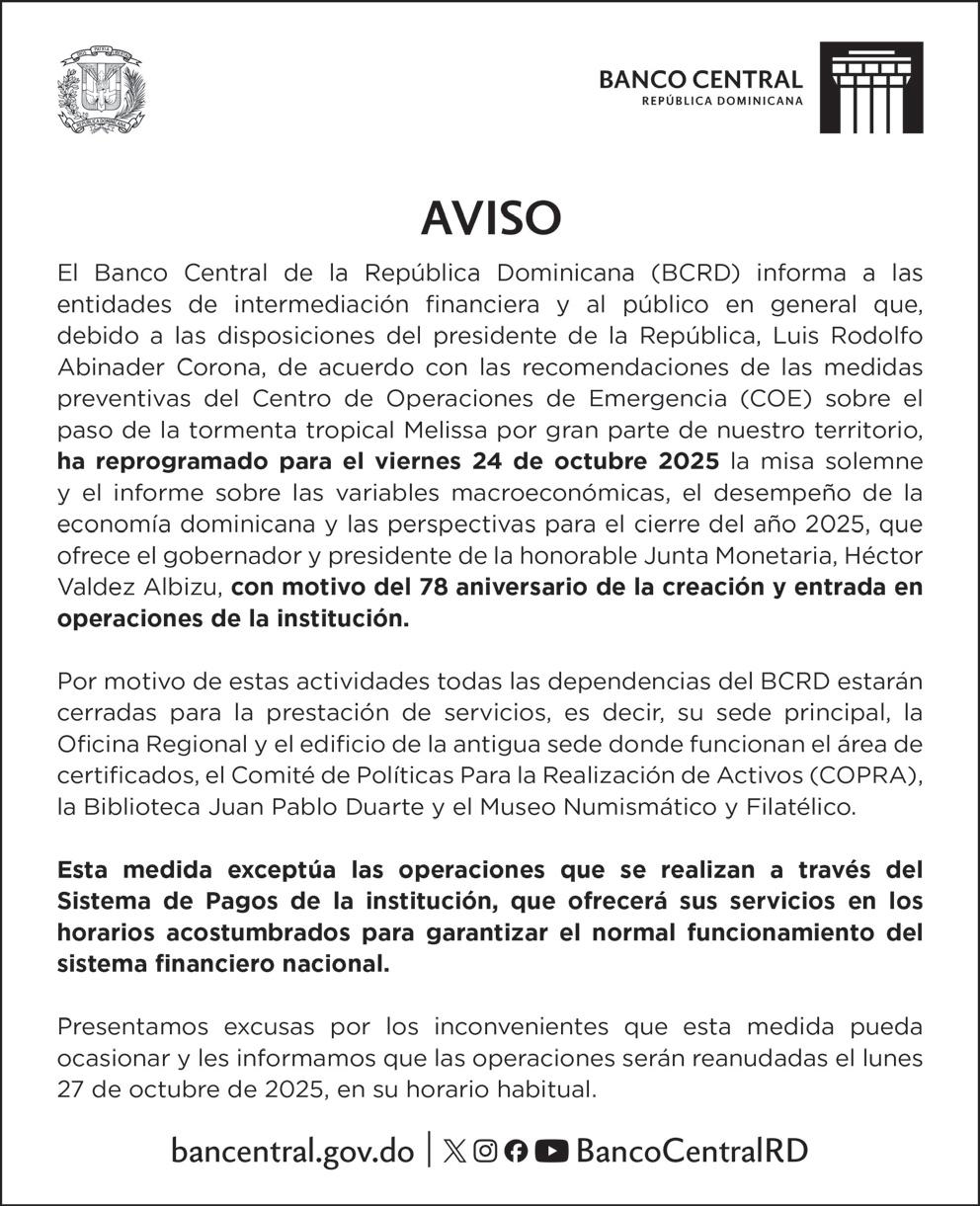 SANTO DOMINGO.- El Comité Organizador del Torneo de Baloncesto Superior del Distrito Nacional (TBS 2025) informó la posposición de la jornada correspondiente a este miércoles, debido al paso de la tormenta tropical Melissa y en atención a las disposiciones emitidas por las autoridades competentes.