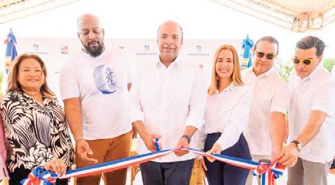 Samuel Pereyra, junto al pelotero Vladimir Guerrero y la alcaldesa del distrito municipal de San Luis, Wendy Cepeda, cortan la cinta inaugural del remozamiento del play.