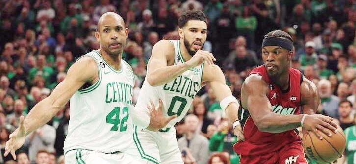 El dominicano Al Horford y Jayson Tatum de los Celtics, defienden a Jimmy Butler, del Heat.