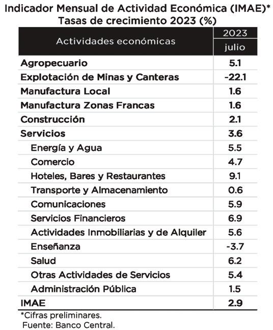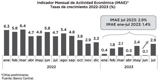 La tasa de crecimiento de la actividad económica en el país se ubicó en el 1.4 % en los primeros siete meses del año con respecto al mismo período de 2022, informó el Banco Central en un comunicado, en el que detalla que el indicador mensual de actividad económica (IMAE) registró un crecimiento interanual del 2.9 % en julio pasado, con "mejorías significativas" en manufactura, construcción, comercio, transporte y agropecuaria P.12