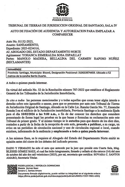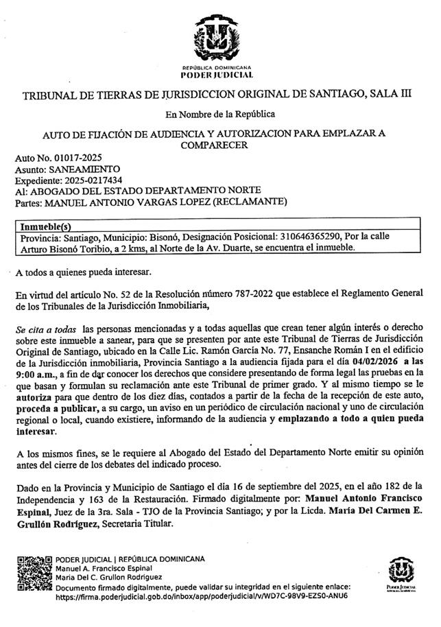 DESIGNACION CATASTRAL NO. 312389037157, RESULTANTE DE LA PARCELA NO. 3881, DEL DISTRITO CATASTRAL NO. 32 DEL MUNICIPIO DE LA VEGA. - A: JULIANA GARCIA ESTRELLA (Solicitante) RECLAMANTE y AGRIMENSOR RAUDIN DE JESUS VASQUEZ JOAQUIN, (CODIA 40035) AL ABOGADO DEL ESTADO DE JURISDICCION INMOBILIARIA DEL DEPARTAMENTO NORTE, Y A TODOS A QUIENES PUEDA INTERESAR. En virtud del artículo 50, del Reglamento de los Tribunales Superiores de Tierras y de Jurisdicción Original de la Jurisdicción Inmobiliaria. SE CITA, a todas las personas mencionadas previamente y a todas las que crean tener algún interés o derecho sobre el inmueble a SANEAR, relativo a la Designación Catastral No. 312389037157, resultante de la Parcela No. 3881, del Distrito Catastral No. 32, con una extensión superficial de 1,969.20 M/2, del Municipio de la Vega, para que comparezcan a la audiencia de SANEAMIENTO fijada por auto rendido por la Segunda Sala del Tribunal de Tierras de Jurisdicción Original de la Vega de fecha 28 febrero del año 2025, audiencia esta que fue aplazada el día 25 del mes de septiembre del año 2025, audiencia que será celebrada en su local que ocupa el Tribunal de Tierras de Jurisdicción Original de la Vega, Primera planta del Palacio de Justicia de La Vega, ubicado en la calle García Godoy No. 32, entre las calles Monseñor Panal y Duvergé, del Municipio de la Vega, para el próximo VEINTE 20 DE FEBRERO DEL AÑO 2026 a las 9:00 A.M, a fin de que presenten las pruebas en las cuales fundamentan sus pretensiones y para que al efecto formulen sus reclamaciones en Jurisdicción Original. En la ciudad de la Vega, Provincia La Vega, Republica Dominicana, a los veintiocho (28) días del mes de octubre del año 2025.RAUDIN DE JESUS VASQUEZ JOAQUIN Codia 40035 (LRMP-AC-41680-WP-U)