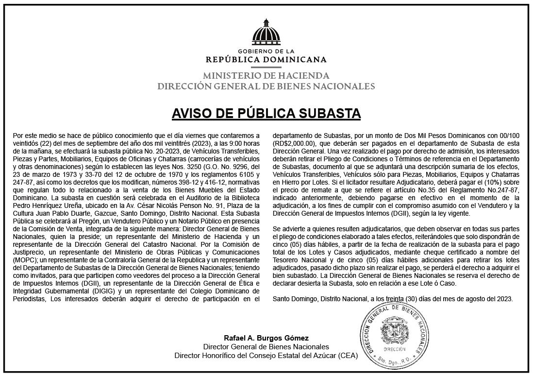 En cumplimiento de las disposiciones contenidas en el artículo 92 párrafo 3 de la Ley #108-05 sobre Registro Inmobiliario y el art.86 del Reglamento General de Registro de Títulos se hace de público conocimiento que se ha extraviado el Certificado de Título de Propiedad matricula NO. 3000612772 que ampara los derechos sobre una porción de terreno con una extensión superficial de 390.98m2 en el ámbito de la Designación Catastral no.313288849451 del Municipio y Provincia La Vega a los fines de obtener el DUPLICADO DEL DUEÑO expedido por el Registro de Títulos del Departamento de La Vega a nombre de OSIRIS RAFAEL ANGELES ESPINAL, Propietario. En la ciudad, municipio y provincia de La Vega, Rep. Dominicana, a los 31 días del mes de AGOSTO del año 2023.