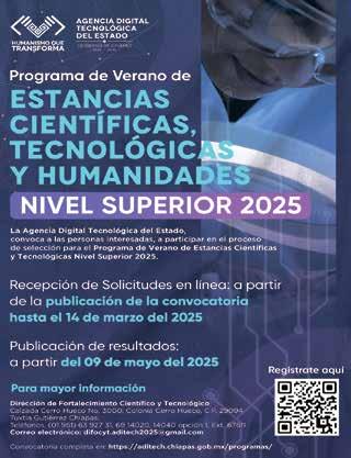 Tuxtla Gutiérrez, Chiapas; 28 de febrero de 2024.- Con el propósito de fortalecer la formación académica y despertar el interés de las y los jóvenes por la investigación científica, tecnológica y humanística, la Agencia Digital Tecnológica del Estado de Chiapas (Aditech) ha lanzado la convocatoria para el Programa de Verano de Estancias Científicas, Tecnológicas y Humanidades, Nivel Superior 2025.