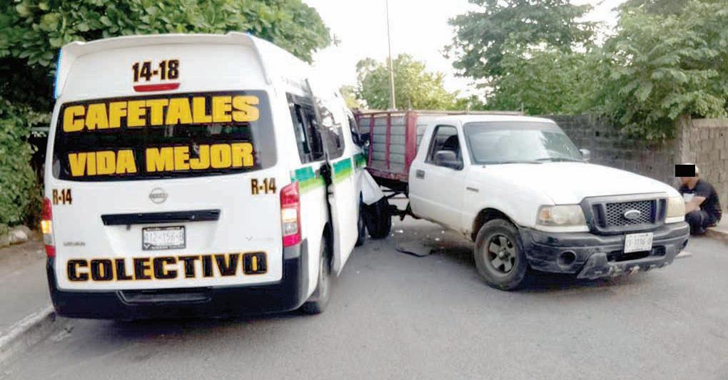 Tapachula, Chiapas; 4 de mayo.- Conductores que transitaban a la altura de la 12ª avenida sur prolongación y camino viejo a Raymundo Enríquez de la colonia Pobres Unidos, reportaron al 911 que en el lugar se había registrado un fuerte accidente automovilístico en el que se involucraron una colectiva de la ruta Cafetales y una camioneta. El perito de Tránsito del Estado, dio a conocer que el responsable es quien conducía la colectiva, ya que invadió el carril contrario. La unidad de pasaje es Nissan Urvan,