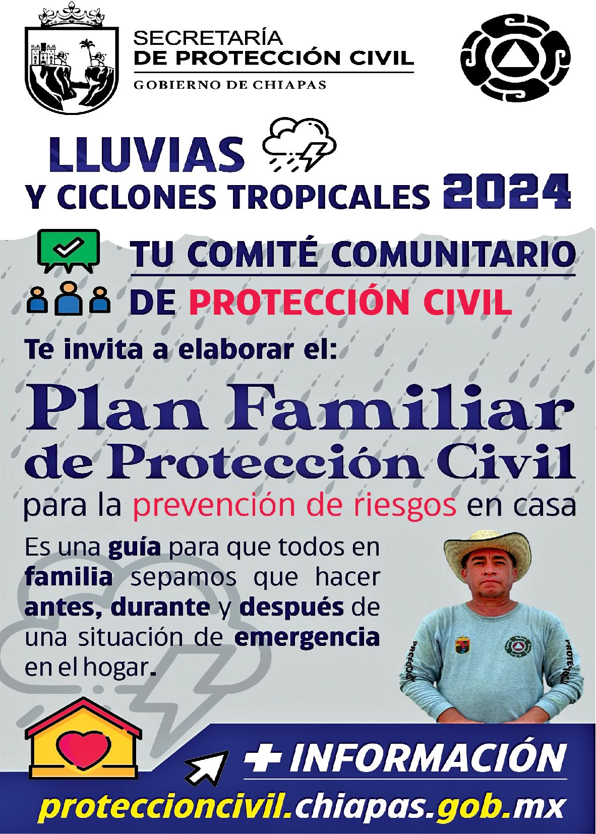 desbordamientos de ríos, flujo de lodo y deslizamiento de laderas por saturación hídrica. En este sentido, se recomienda a la población a mantenerse atenta a los avisos oficiales en medios de comunicación, evitar cruzar ríos, arroyos y calles con pendientes o inundables, reforzar techos, ventanas y puertas, no circular en zonas de riesgo y, en caso de vivir en zona de riesgo, ubicar su refugio temporal más cercano. La dependencia estatal convoca a implementar en cada hogar el Plan Familiar de Protección Civil, con la finalidad de detectar y reducir riesgos, como parte de esto diseñar rutas de evacuación y marcar zonas de menor riesgo, así como contar con la mochila de emergencia. Además, se invita a la población a tomar de manera gratuita el curso virtual que imparte la Escuela Nacional de Protección Civil Campus Universitario Chiapas “La Protección Civil en el Hogar”. En el marco de la Mesa de Seguridad, que encabeza el gobernador Rutilio Escandón Cadenas, se coordinan acciones de prevención y atención a la población, informó el secretario de Protección Civil en Chiapas, Luis Manuel García Moreno. Se pide a la población mantenerse informada y seguir todas las recomendaciones en materia de protección civil, las cuales se comparten a través de medios oficiales y redes sociales, en X (antes Twitter) @pcivilchiapas y en Facebook Protección Civil Chiapas; en caso de una emergencia contactar a Protección Civil o llamar al 911 para su pronta atención. Boletín Oficial