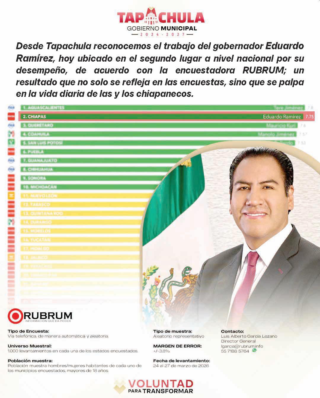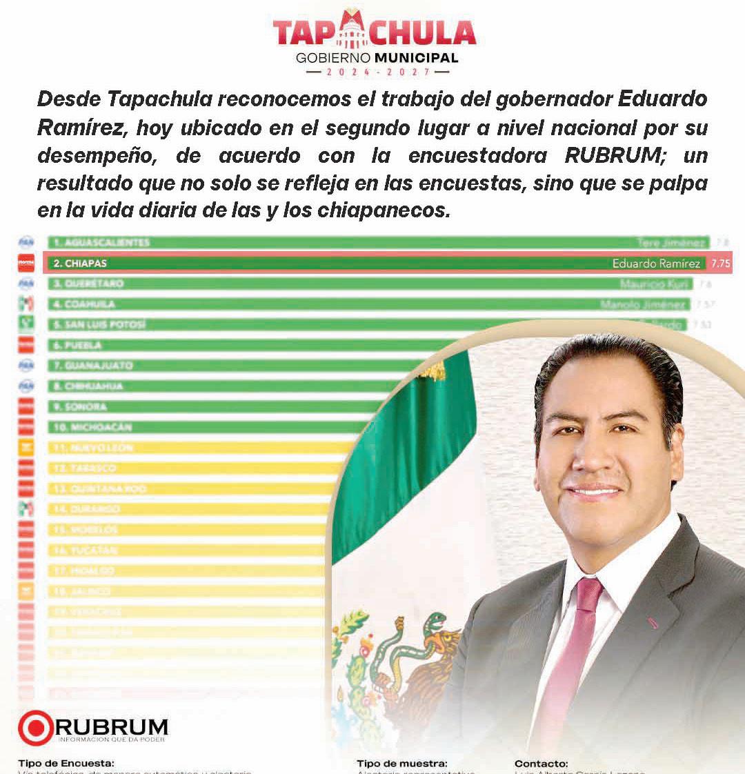 Destaca ERA en 2º. Lugar a Nivel Nacional en Aprobación a su Desempeño Tenemos un Gran Gobernador, Eduardo Ramírez. Su Trabajo no Sólo se Refleja en Las Encuestas, Sino en la Vida Diaria de Todas y Todos los Chiapanecos, Reconoce la Ciudadanía