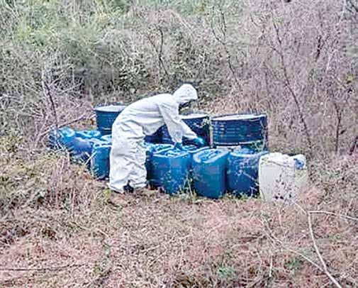 En esos puntos se encontró mil 430 litros de una sustancia química desconocida, tres mil 766 litros de acetona, mil 645 de ácido clorhídrico, mil 350 litros de alcohol, 450 litros de tolueno, 830 litros de thinner, 170 litros de ácido fosfórico, 80 de metanol, 50 de alcohol ferroso y 40 litros de ácido muriático.