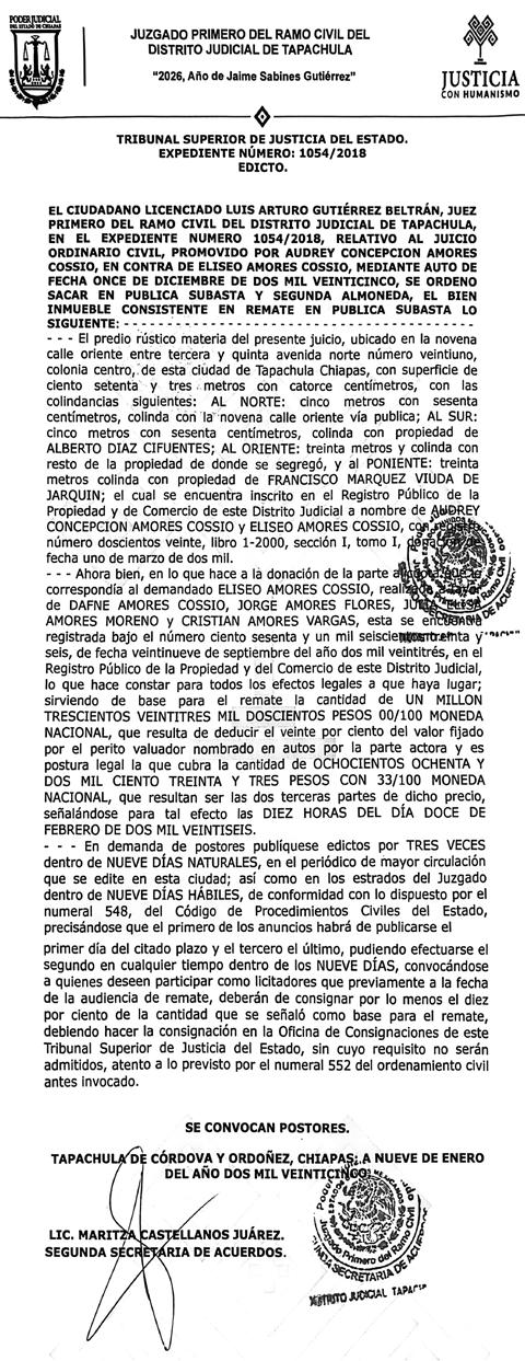 Desde Tapachula, Chiapas, el magistrado presidente del Poder Judicial, Juan Carlos Moreno Guillén, participó activamente en la Mesa de Paz que encabeza el gobernador Eduardo Ramírez Aguilar, en donde se diseñan y presentan resultados de las estrategias interinstitucionales enfocadas a la seguridad y bienestar del pueblo chiapaneco. En este espacio, Moreno Guillén reafirmó el compromiso del Poder Judicial de impartir una justicia más humanista que priorice el respeto a los derechos humanos, fortalezca el acceso a la justicia y contribuya a la construcción de un Chiapas más seguro, justo y en paz.Boletín Oficial