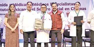 En el Teatro Universitario de la Universidad Autónoma de Ciencias y Artes de Chiapas (Unicach) el mandatario estatal y el titular del Seguro Social realizaron la entrega simbólica de 10 nombramientos a médicas y médicos especialistas, en reconocimiento a su decisión de laborar en esta entidad para favorecer la salud de las y los chiapanecos con atención oportuna y trato digno.