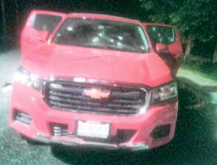 La camioneta rafagueada es una marca Chevrolet S-10, de color rojo,