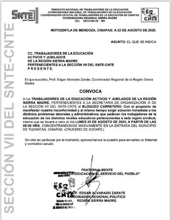 La Coordinadora Regional Sierra Madre del SNTE-CNTE ha convocado a un bloqueo carretero este lunes 25 de agosto de 2025, a partir de las 8:00 de la mañana, en el crucero de Xochiltepec, a la entrada del municipio de Tuzantán, en la Costa de Chiapas.