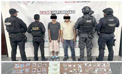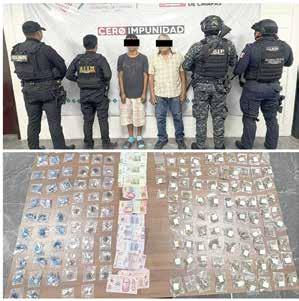 También se les encontró ocho cargadores abastecidos para armas automáticas, cuatro cintas metálicas eslabonadas con 100 cartuchos, un vehículo Honda HR-V con reporte de robo, 100 bolsas de plástico con un polvo blanco granulado, igual número de bolsas con un polvo blanco y una bolsa con una hierba verde, similar a la marihuana.