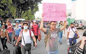 personas de la tercera edad. Según datos proporcionados por los extranjeros, son un promedio de 400 menores de edad, entre ellos niños de cinco años y hasta de meses. Así como mujeres embarazadas, los que todavía resienten el cansancio y presentan algunas enfermedades respiratorias, diarreicas y otros padecimientos. El contingente que se quedó a descansar en el campo Santa Cruz en Mapastepec, acordó salir hasta las diez de la noche de este lunes con el apoyo de las autoridades, ya que muchos todavía no se recuperan de la deshidratación. Así como vienen muchas mujeres embarazadas.