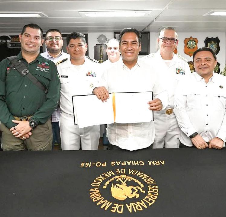 su compromiso de continuar trabajando en conjunto por el bienestar común, buscando un equilibrio entre la productividad y la conservación de los ecosistemas marinos. Boletín Oficial Eduardo Ramírez Recorre el Buque ARM Chiapas y Reconoce Labor de la Zona Naval El gobernador Eduardo Ramírez Aguilar, acompañado por el comandante de la 22 Zona Naval, Martín Felipe de Jesús Santillán Murillo, y el comandante interino de la VII Región Militar, Alejandro Vargas González, realizó un recorrido por el buque ARM Chiapas, destinado a labores de patrulla oceánica para proteger la seguridad y la soberanía nacional. En ese contexto, el mandatario agradeció al vicealmirante Santillán Murillo por su hospitalidad y el respaldo en las tareas de mantener la paz en Chiapas. Asimismo, reconoció y felicitó al capitán de Fragata, José Miguel Rodríguez Rosado, así como al personal de la Zona Naval que diariamente trabaja en esta embarcación para salvaguardar la integridad de la ciudadanía. Boletín Oficial