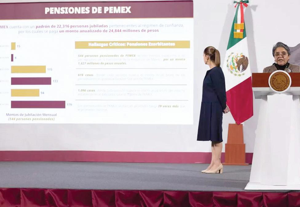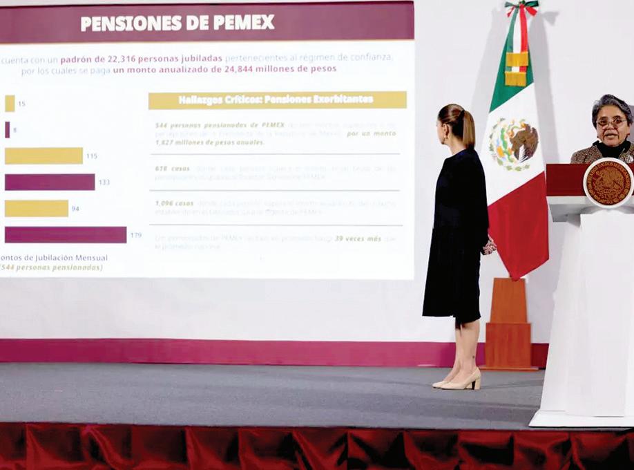 Al calificarlas como “pensiones exhorbitantes”, Raquel Buenrostro, secretaria Anticorrupción y Buen Gobierno, reveló que 9 mil 457 extrabajadores de Luz y Fuerza del Centro (LyFC), reciben una pensión de 100 mil a un millón de Pesos mensuales, mientras que 544 pensionados de Pemex reciben montos superiores a las percepciones de la presidenta Claudia Sheinbaum Pardo, por un monto de mil 827 millones de Pesos anuales.