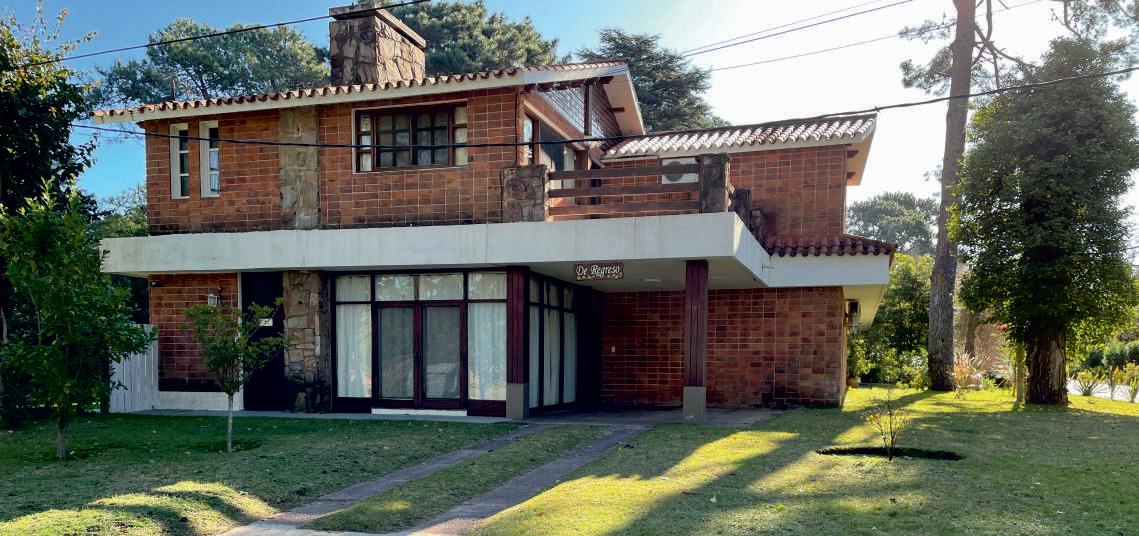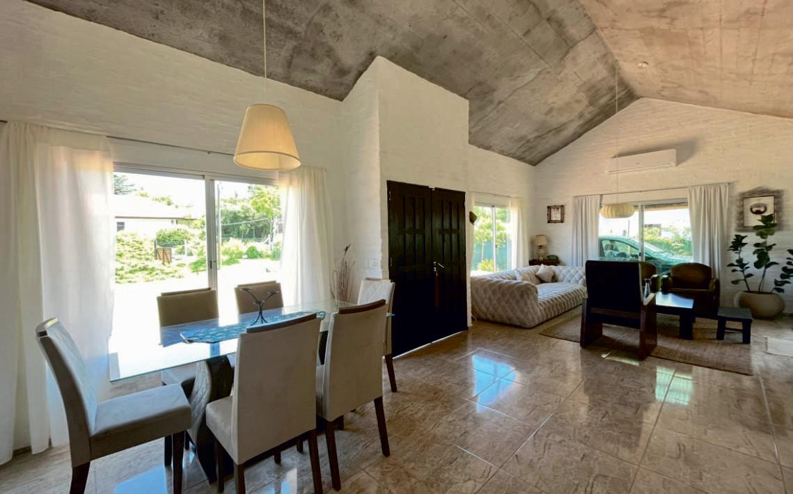CASA de2plantasubicadaa2cuadrasdela playaSolana,de3dormitoriosy2baños. Conlivingconestufaaleña, comedorycocina integrada.Alfondoparrillerotechado.
