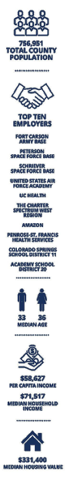 El Paso County is home to eight municipalities, each contributing to the community’s geographic, economic, and social diversity. With an estimated population of 756,951 residents, El Paso County provides citizens with a thriving downtown, family-friendly suburbs, and vast rural expanses. The county is also home to five vital military installations, from the prestigious United States Air Force Academy to Fort Carson. Each base supports a crucial strategic mission for our nation’s defense. In addition, over 100,000 active or retired military personnel call El Paso County home.
