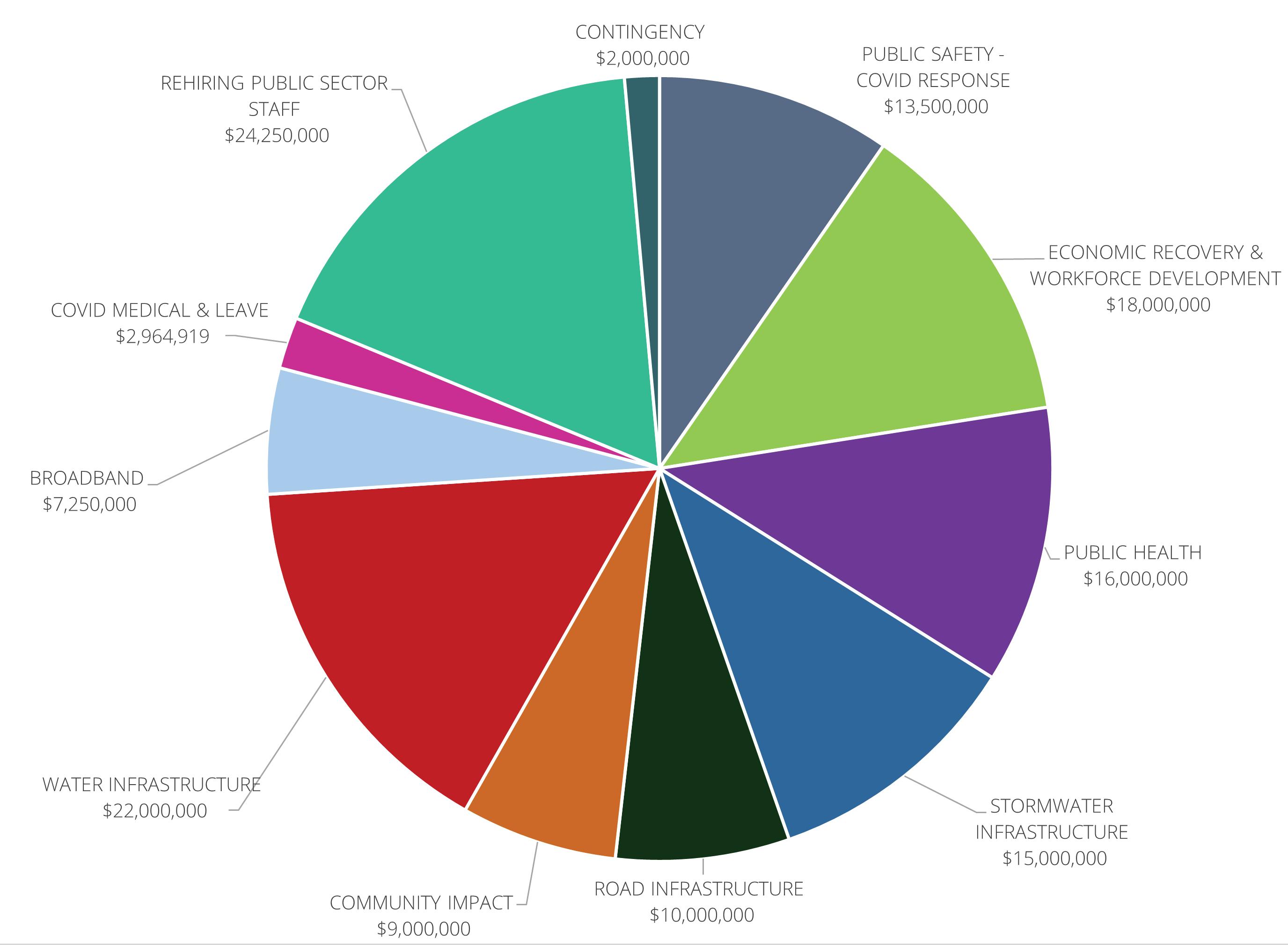 PAGE 15 PUBLIC SAFETY - COVID RESPONSE ........................................ $13.5 MILLION ................................................ 9.6% ECONOMIC RECOVERY & WORKFORCE DEVELOPMENT ...... $18 MILLION ................................................ 12.9% WATER INFRASTRUCTURE ........................................................ $22 MILLION ................................................ 15.7% PUBLIC HEALTH ......................................................................... $16 MILLION ................................................ 11.4% STORMWATER INFRASTRUCTURE ........................................... $15 MILLION ................................................ 10.7% ROAD INFRASTRUCTURE (GOVERNMENT SERVICES) ............ $10 MILLION ................................................... 7.1% COMMUNITY IMPACT................ ............................................... $9 MILLION ..................................................... 6.4% BROADBAND INFRASTRUCTURE ............................................. $7.25 MILLION ................................................ 5.2% COVID MEDICAL & LEAVE ......................................................... $2.9 MILLION .................................................. 2.1% REHIRING PUBLIC SECTOR STAFF ........................................... $24.2 MILLION ............................................. 17.3% CONTINGENCY .......................................................................... $2 MILLION ..................................................... 1.4%