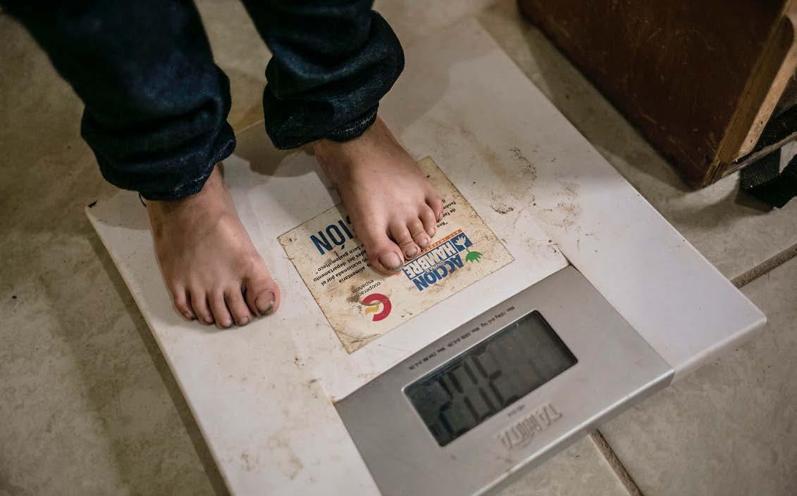 Detalle de los pies de un niño sobre una báscula que indica su bajo peso en Camotán, Chiquimula.